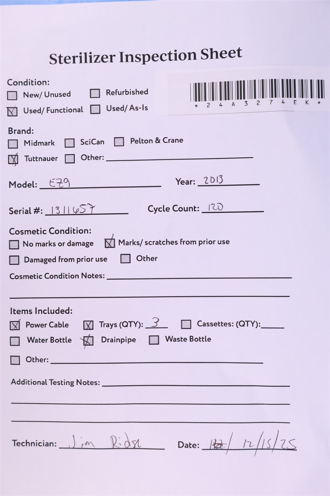 1 - Tuttnauer EZ9 Autoclave - Steam Sterilizer 3 - Sterilizing Trays w/ Rack 1 - Drain Hose 1 - Power Cord