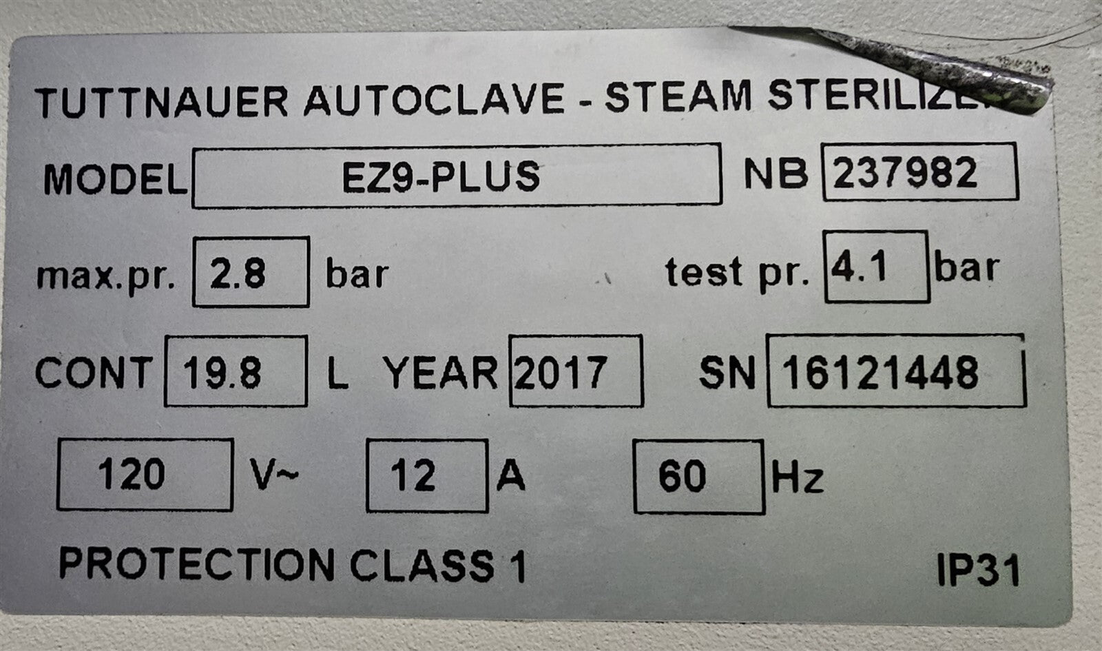 1 - Tuttnauer EZ9 PLUS Autoclave 3 - Sterilizing Trays w/ Rack 1 - Power Cord