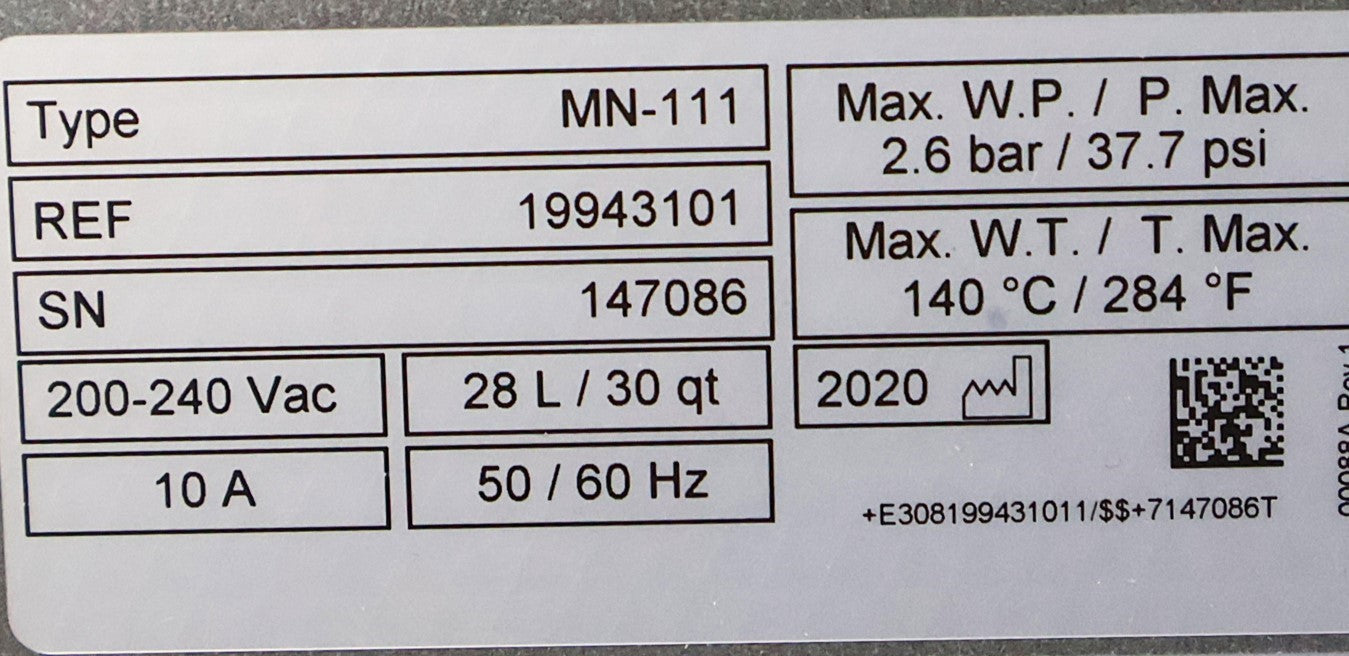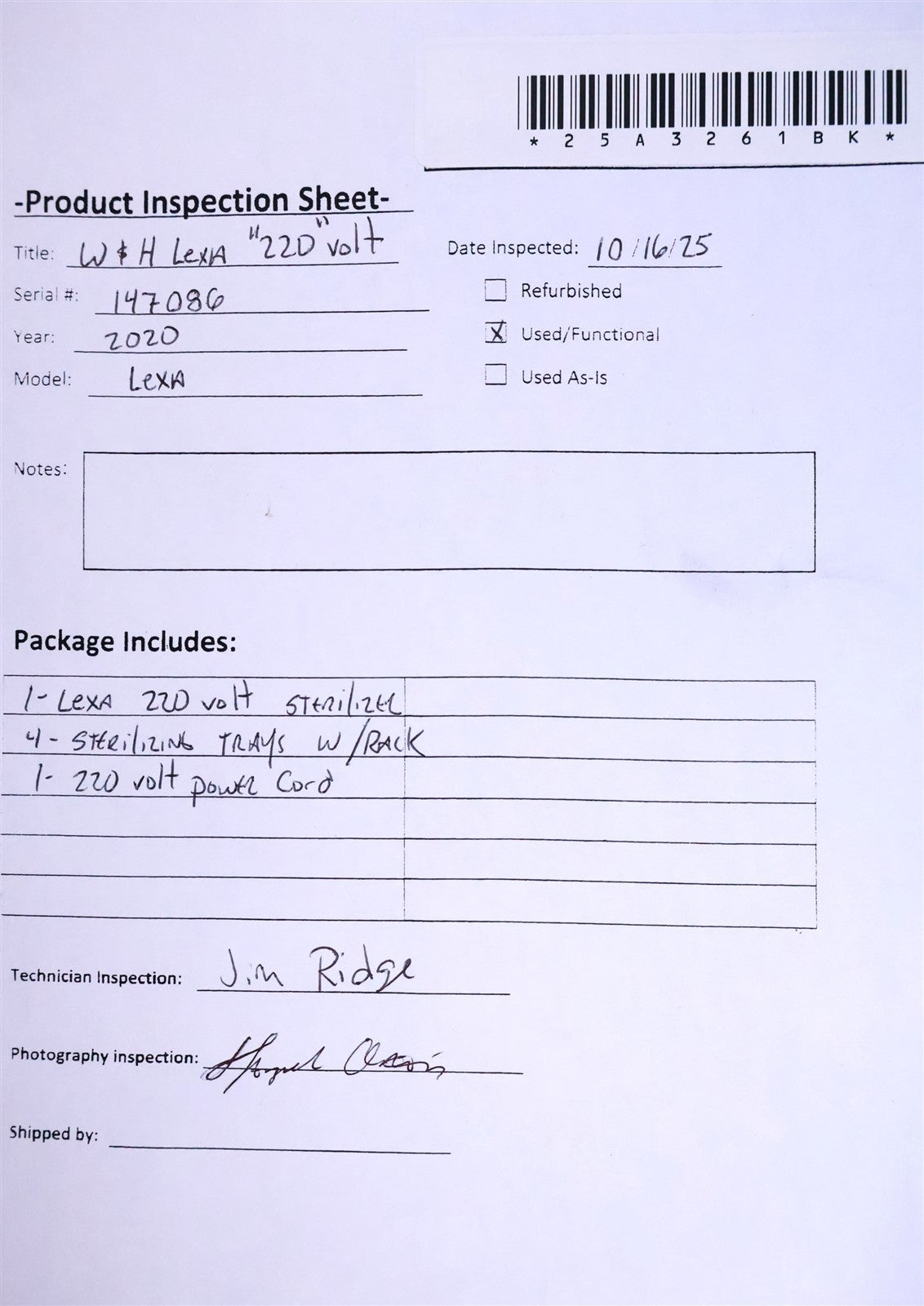 1 - W&H Lexa 220 Volt Sterilizer 4 - Sterilizing Trays w/ Rack 1 - 220 volt Power Cord