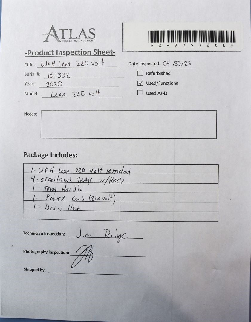 1 - W&H Lexa 220 volt Sterilizer 4 - Sterilizing Trays w/ Rack 1 - Tray Handle 1 - Drain Hose 1 - 220 Volt power cord