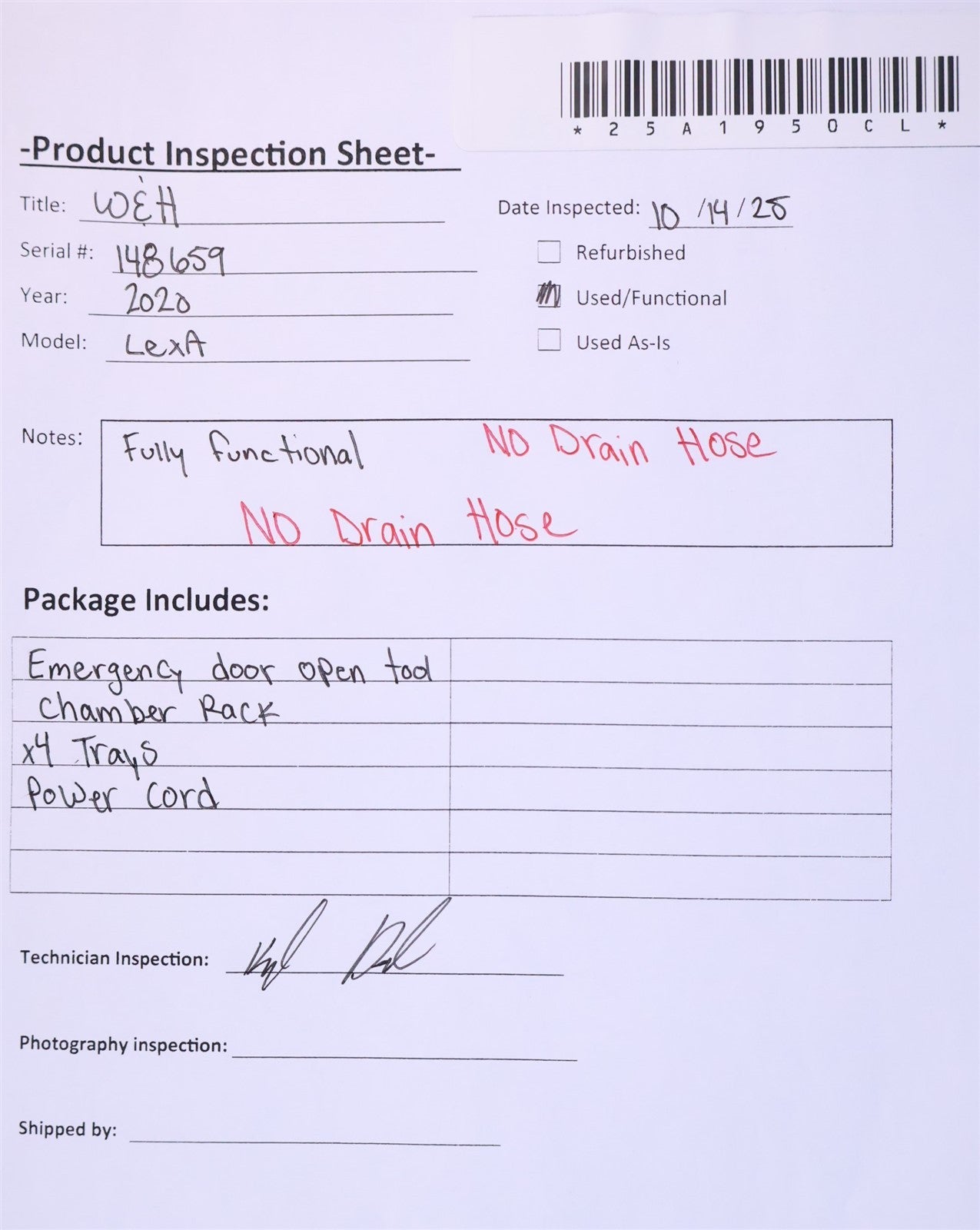 Your purchase will NOT include: DRAIN HOSE. TRAY REMOVAL TOOLThis product is pre-owned and may not include the same accessories as a new, unused unit. - other accessories not shown or listed here.Prior to function testing this W&H Lexa Sterilizer, unit was visually inspected for any damage or missing parts that would prevent units complete and intended function. Unit is complete, including chamber rack, 4 trays, power cord, emergency door open tool. Proceeded to attach unit to required 120V power source. Unit successfully powered on with no complications or error codes presented on digital touch screen display. Flipped through the touch screen displays interface to ensure touch screen is responsive and all features on display respond, which they do. I then filled clean water reservoir and ran the first cycle. Units automatic door lock system locked door with no issues. Sterilizer successfully completed cycle with no disruptions. Ran an additional two more cycles. One short and the last cycle ran being the longest duration for sterilizing phase (being 30min) again, successful. Drained both reservoirs (clean and dirty) UNIT DOES NOT INCLUDE DRAIN HOSE. FULLY FUNCTIONAL.