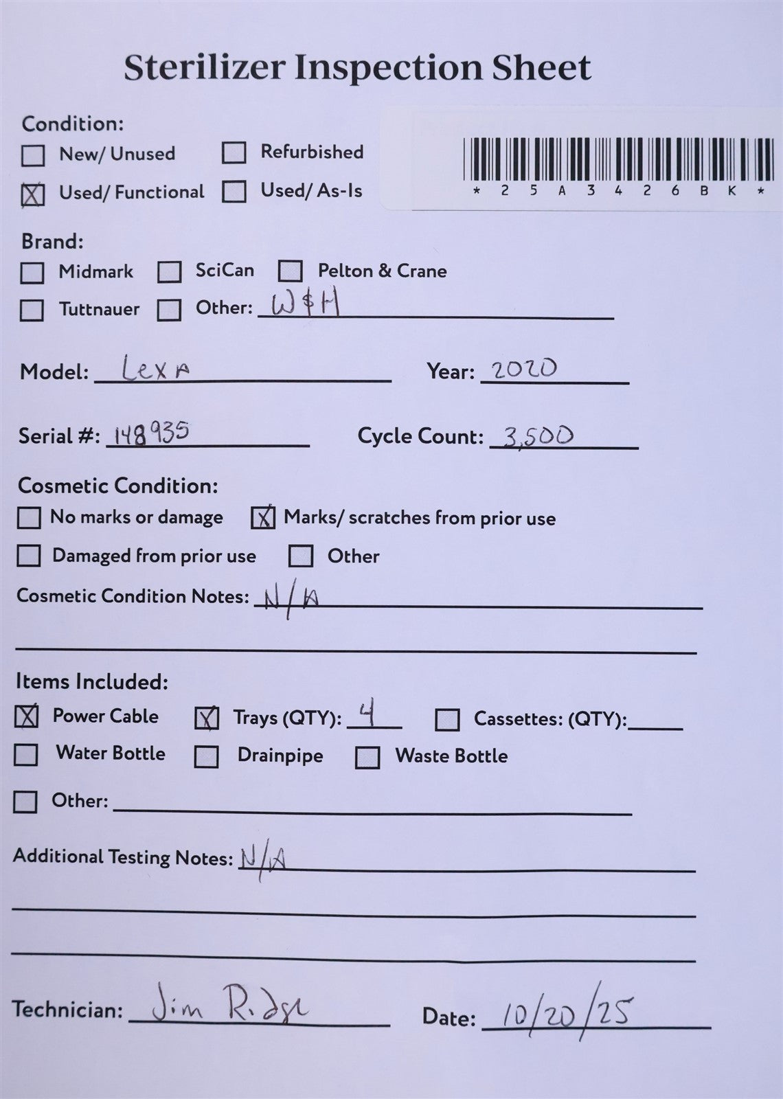 Your purchase will NOT include: This product is pre-owned and may not include the same accessories as a new, unused unit. - other accessories not shown or listed here.Inspected Autoclave inside and out. This sterilizer is lightly used 2020 model autoclave, with only 3,500 cycles run on it. Sterilizing chamber and trays have some staining and decolorization from prior usage. To test this autoclave, it was connected to a 120 Volt power source, distilled water was added and then it was run through some preset sterilizing and drying cycle. to verify that this autoclave is achieving it's maximum required sterilizing temperature, it was temperature tested using a Max Register Thermometer, and found to reach 273 F during a sterilizing cycle.
