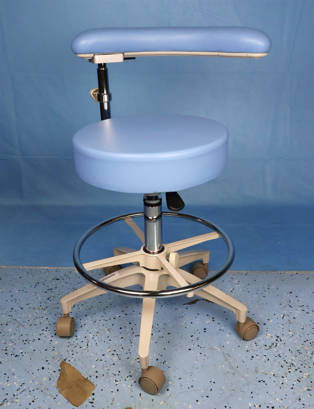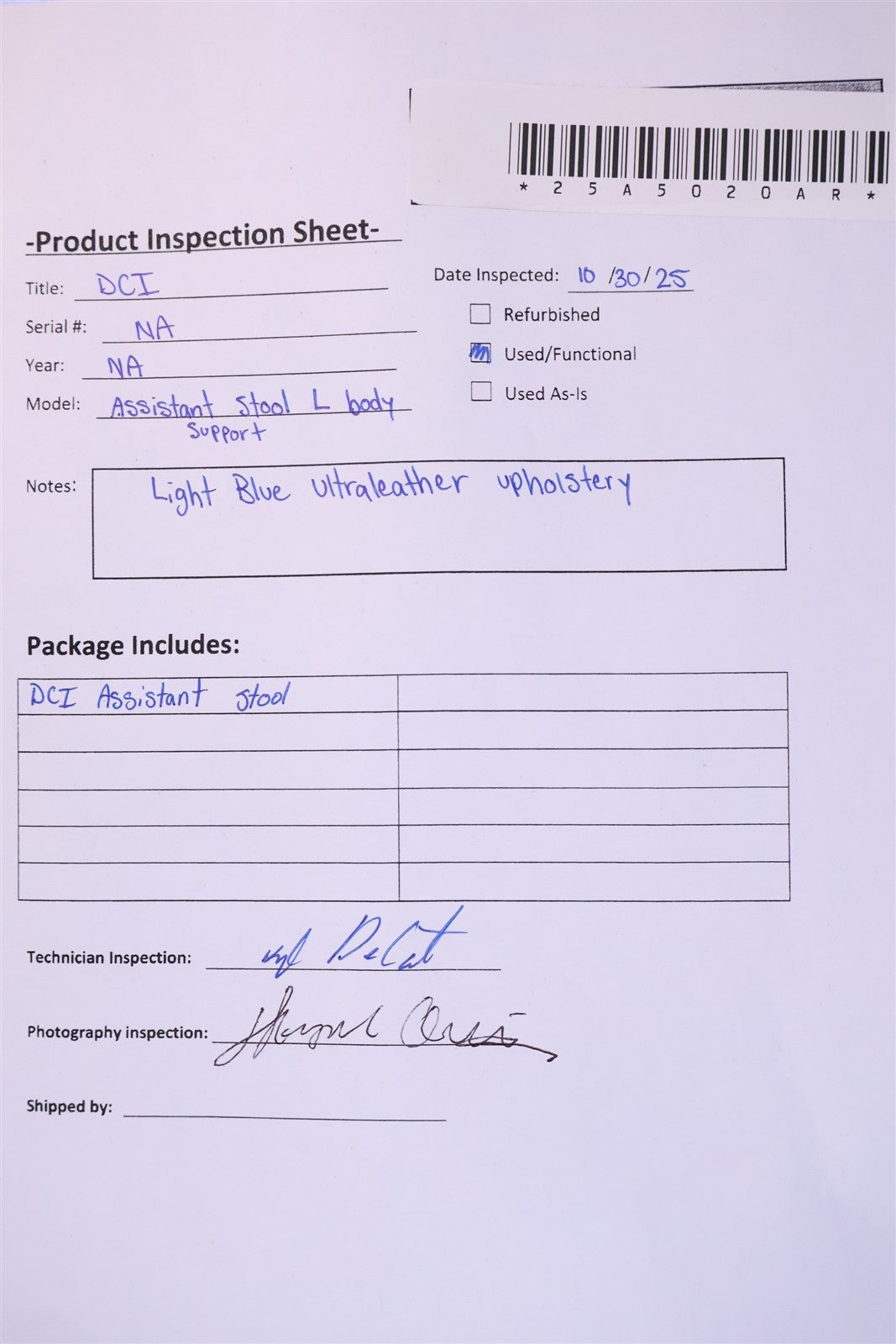 Visually inspected this DCI assistant stool with left body support for any damage. NO damage to note. Upholstery is light blue ultraleather.