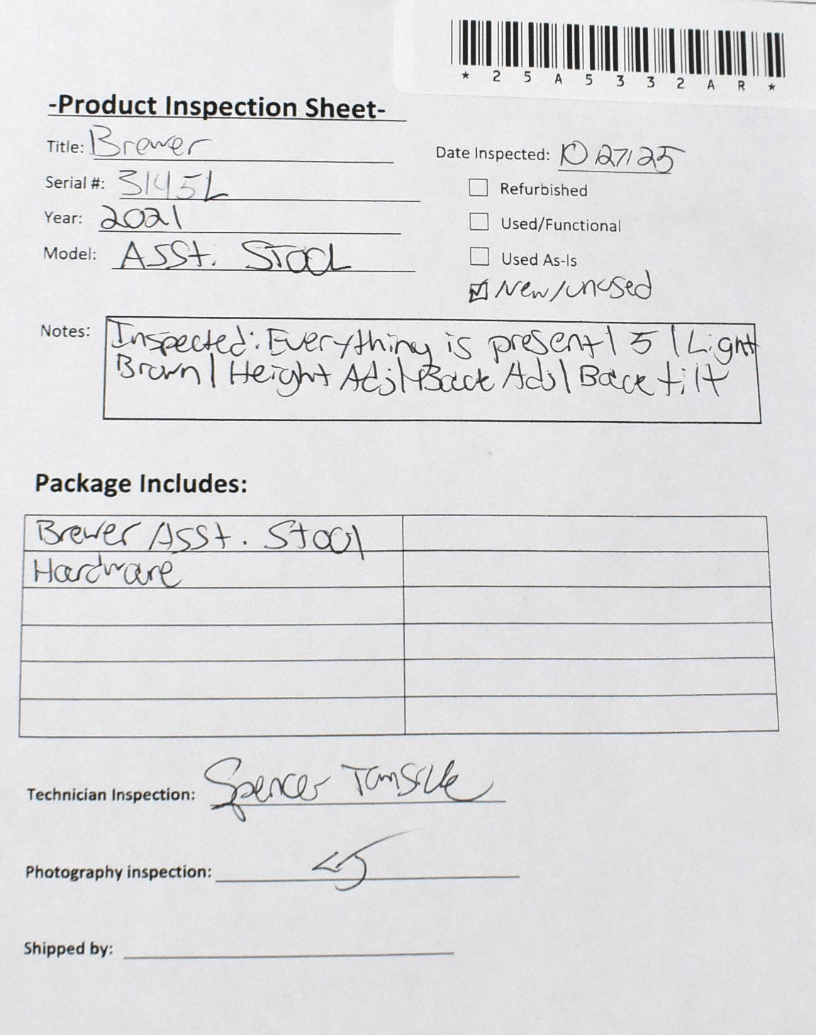 Brewer Asst. Stool, Hardware, Manual