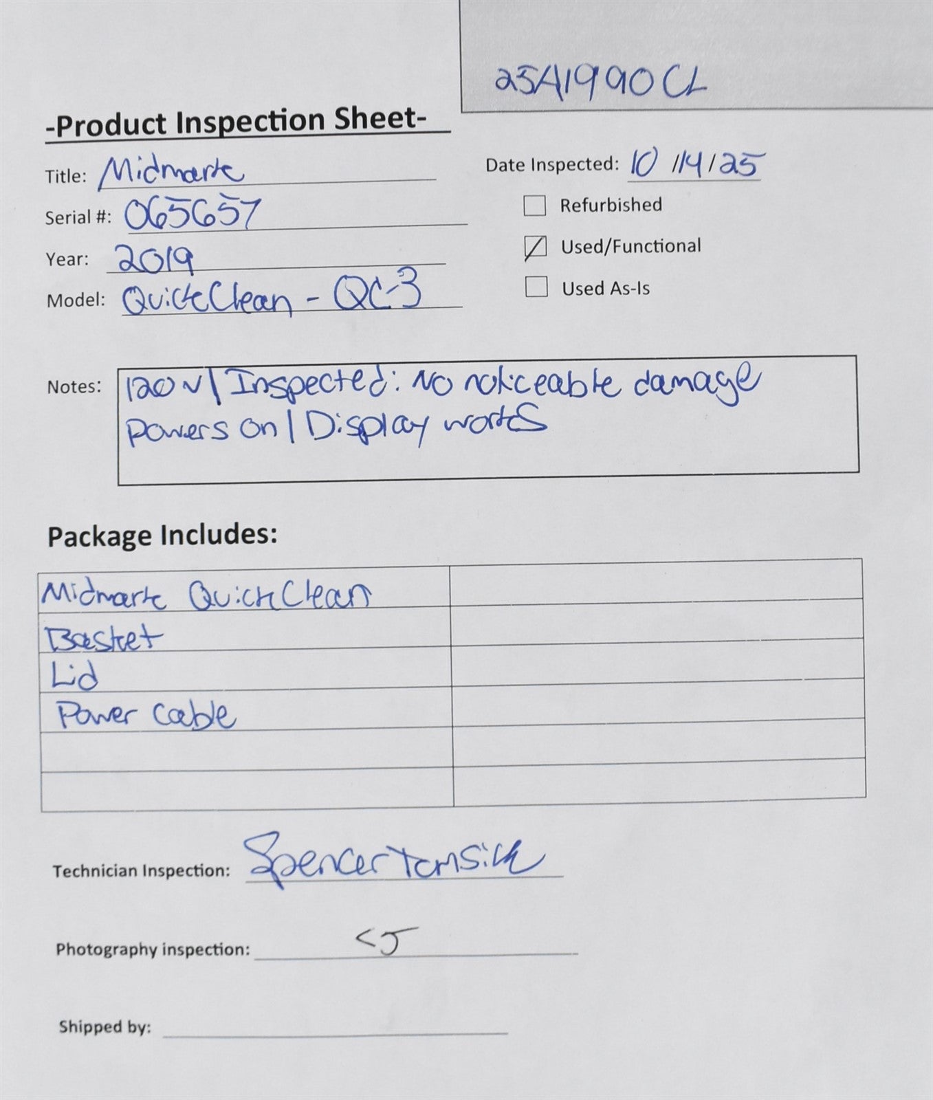 Your purchase will NOT include: This product is pre-owned and may not include the same accessories as a new, unused unit. - other accessories not shown or listed here.Perform a foil test by degassing the Midmark QuickClean Ultrasonic Cleaner, placing aluminum foil in the chamber, running a full cycle, and verifying the presence of holes in the foil to confirm proper cavitation and functionality