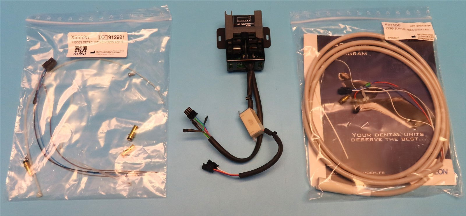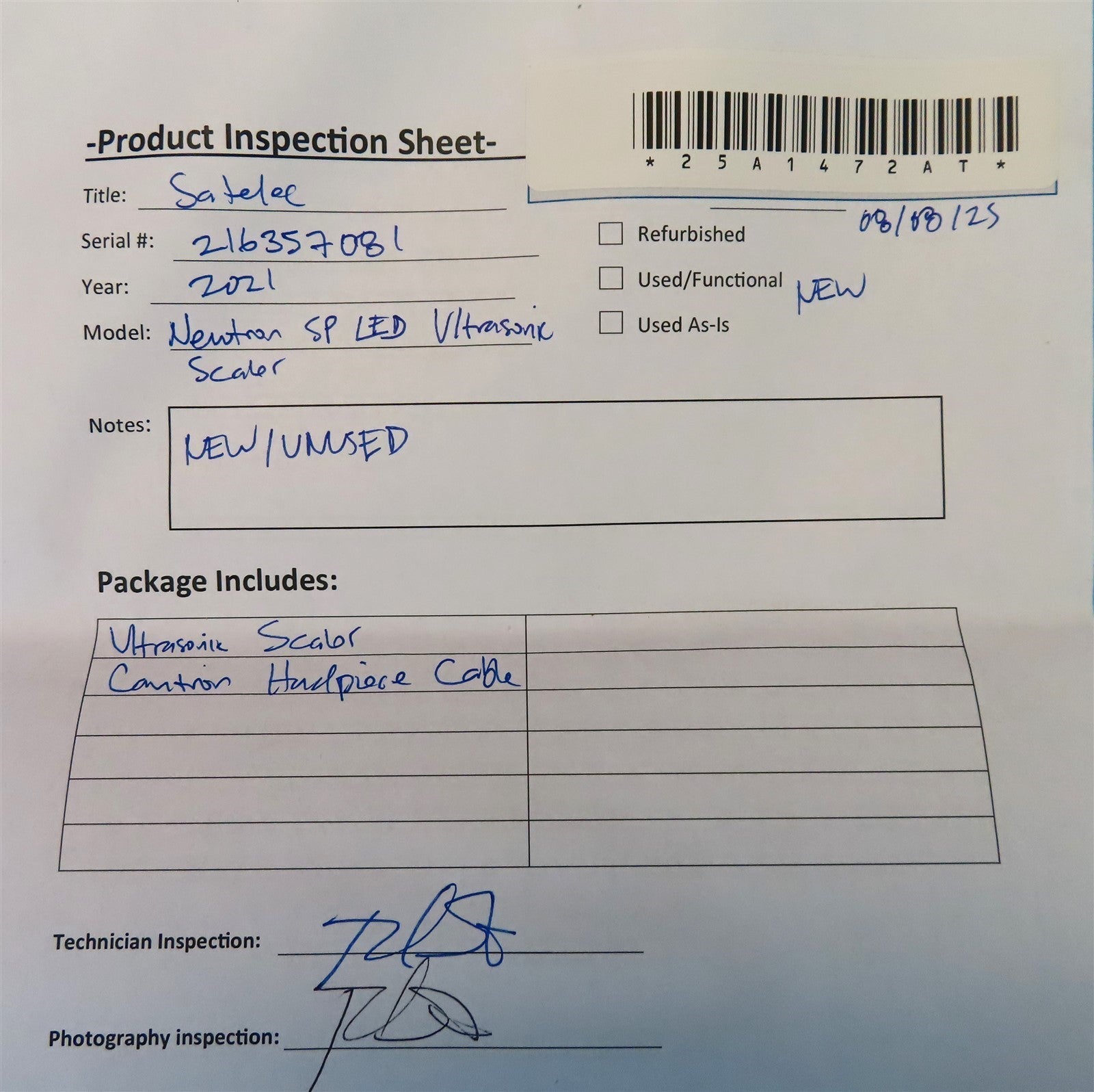Your purchase will NOT include: water hose, air hose - other accessories not shown or listed here. Satelec Newtron SP LED Key Features Satelec Newtron SP LED Ultrasonic Scaler - Key Features NEWTRON® Technology: Patented technology with controlled linear vibrations and automatic frequency adjustment for precise, safe, and efficient treatments. LED Handpiece: Fully autoclavable LED lighting improves visibility in the oral cavity for enhanced precision during procedures. Color Coding System (CCS): Intuitive power settings with color-coded tips: Green: Low power for subgingival scaling, root planing, perio, and implant maintenance. Yellow: Medium power for endodontics, re-treatments, and surgery. Blue: High power for supragingival scaling and cavity preparation. Orange: Very high power for condensing composites and removing posts/crowns. High-Quality Tips: Over 80 exclusive, patented designs made from specific steel to preserve enamel and anatomy, with no need for sharpening. B.LED Technology: Real-time plaque detection and removal using F.L.A.G. developer liquid for enhanced treatment accuracy. Versatile Applications: Supports perio, root planing, endodontics, surgery, implantology, and prosthetics with a wide range of tip designs. Controlled Irrigation: Drop-by-drop technique ensures precise water delivery to the tip, reducing splatter and improving patient comfort. Ergonomic Design: Sleek, balanced handpiece with customizable, autoclavable silicone holders for reduced hand fatigue and easy cleaning. Gentle Vibrations: Linear, regular vibrations minimize gingival damage and cementum removal, ideal for sensitive patients, pediatrics, and geriatrics. Integration Compatibility: Seamlessly integrates with dental delivery units like A-dec, Pelton & Crane, and DentalEz for easy access and operation.Visually inspected the unit for any damages or missing parts and accessories. This unit is new/unused.