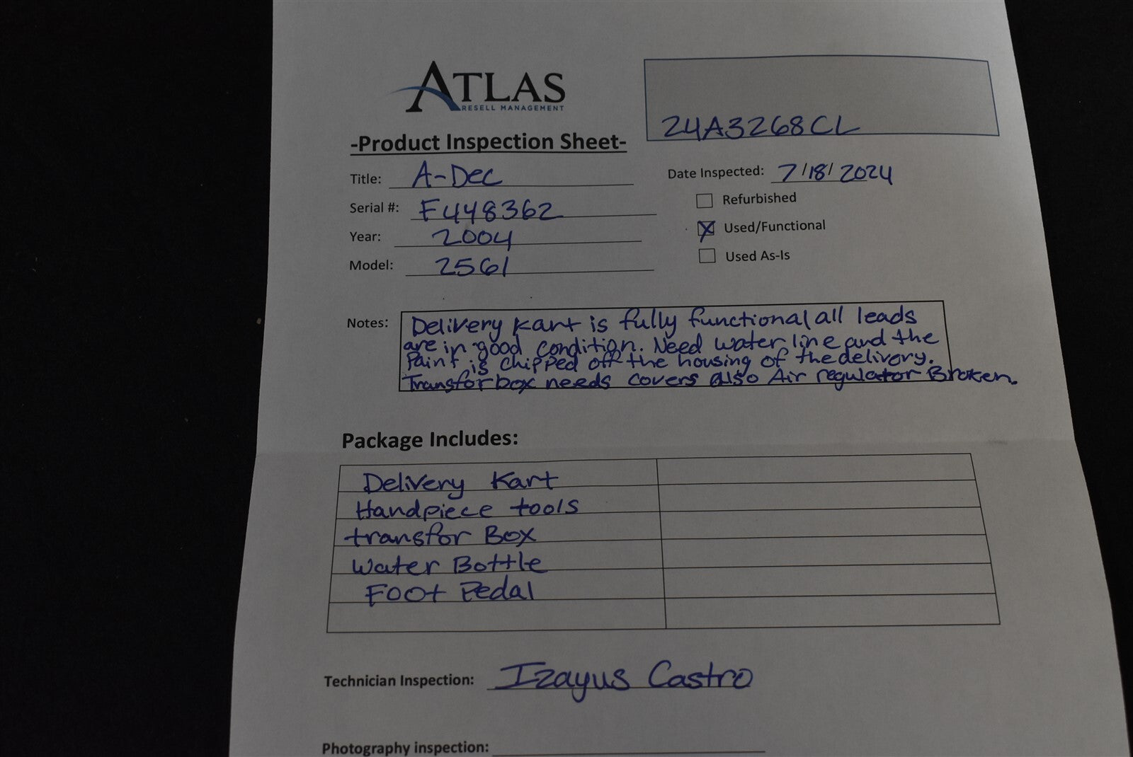 Your purchase will NOT include:Needs water line.This product is pre-owned and may not include the same accessories as a new, unused unit. - other accessories not shown or listed here.Delivery kart is fully functional all leads are in good condition. Need a water line the paint is all chipped off the housing of the delivery kart. The transfer box needs covers and PSI regulator is broken.