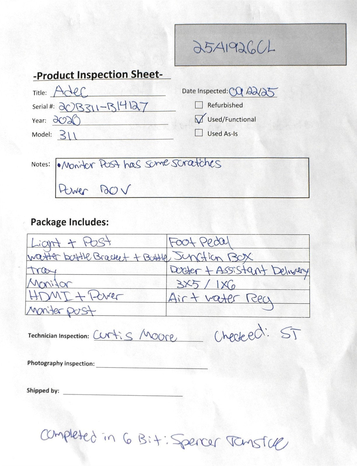 Light & Post, Water bottle mount & Bottle, Monitor Post, Monitor, HDMI & Power, Tray, Junction box, Post mounted Doctor & Assistant Delivery (three 5 hole & one 6 hole), Air & Water regulator, Delivery foot pedal.