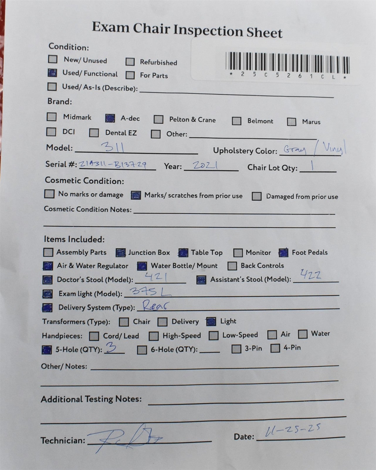 - Exam Chair Serial Number: 21A311-B13729