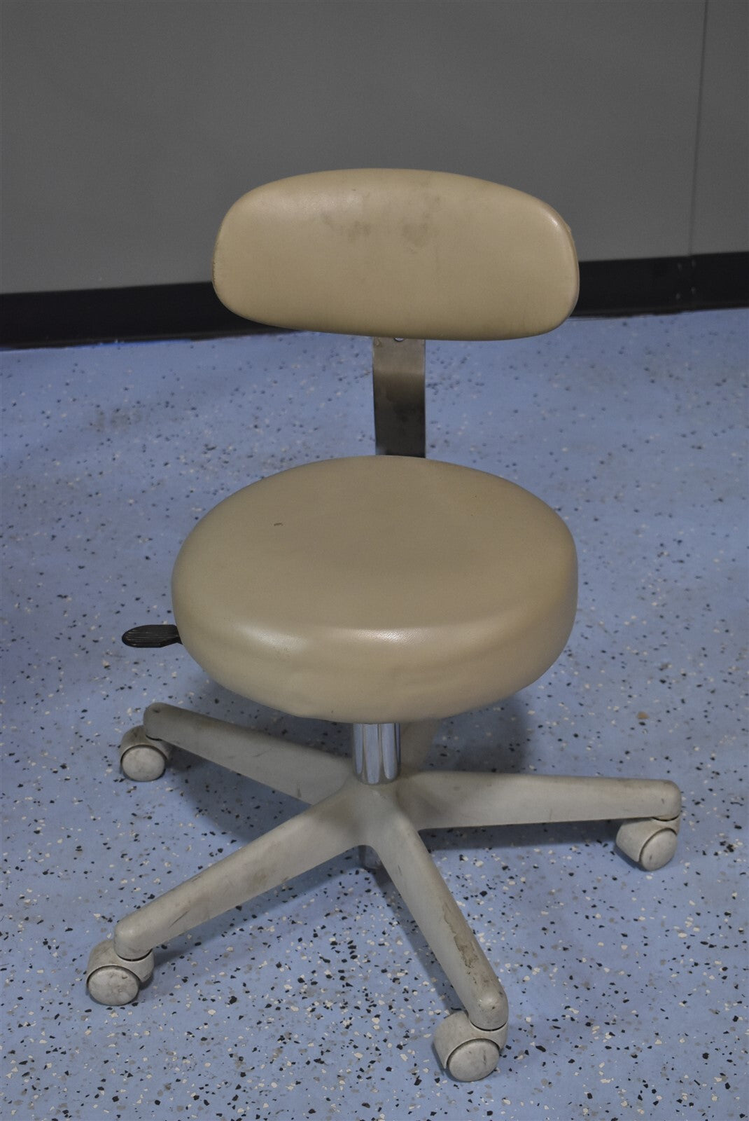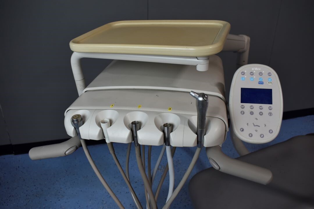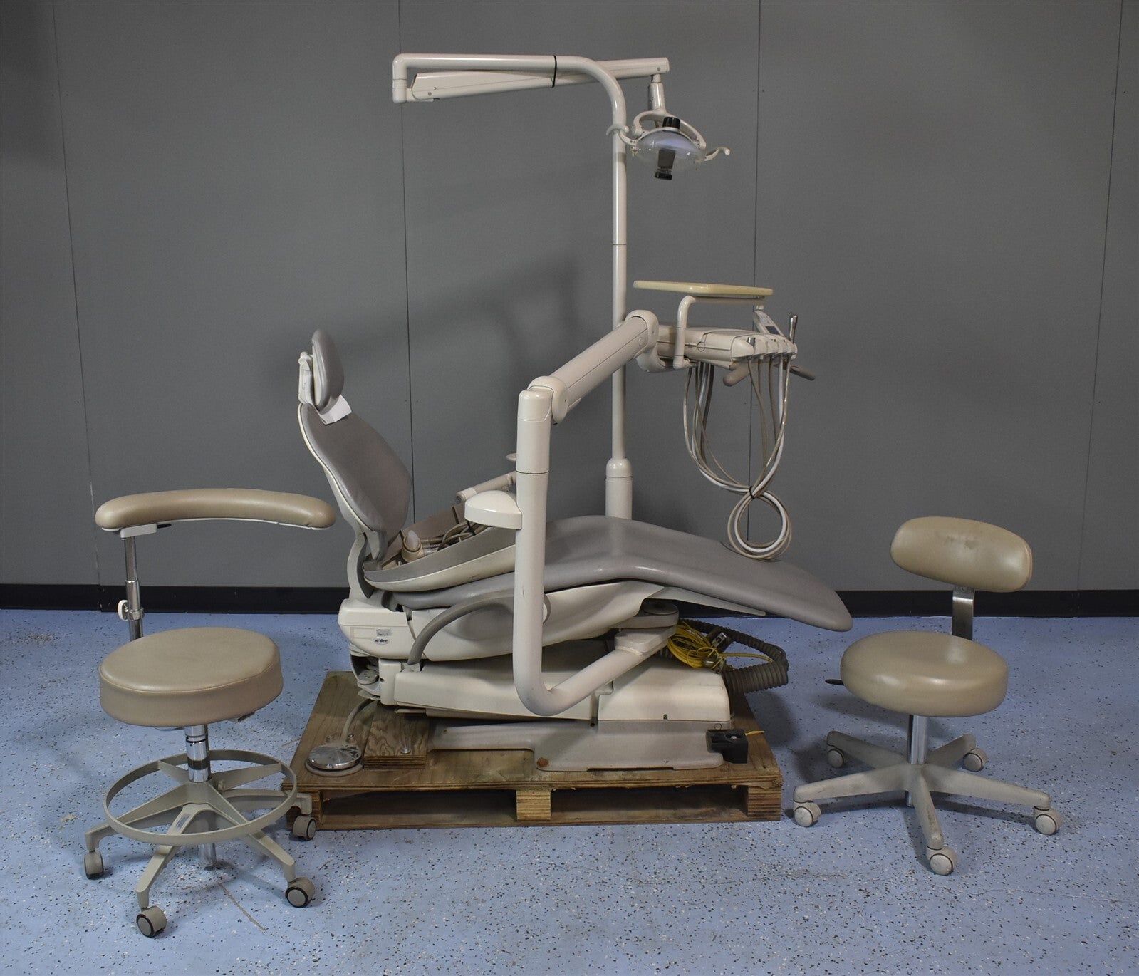 I plugged the power cord of this chair to a 120V power source and manually turned it on. Then I used both the back and front control panels to test the chair lift, its front and back leaning, and the light. At first, it could raise itself, lean back, and turn the light on, but wouldn't go back down or lean forward. Then I added an Adec foot pedal which could control the chair without issue, meaning it was the RJ11 cords connected to the panels that were non-functional, so I removed both of them. Once new cables are added this unit will be fully functional. The cosmetic condition is good, but there is some stains, rust and gunk buildup that I couldn't remove on some of the surface of the unit and the cords. Both stools are in good condition with some marks on their upholstry and frame. -BH