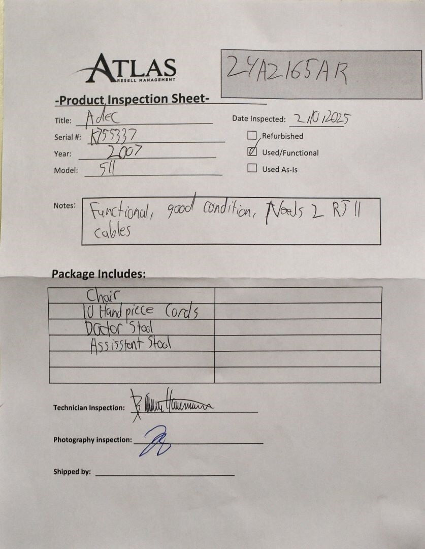 Your purchase will NOT include: 2 RJ11 CablesThis product is pre-owned and may not include the same accessories as a new, unused unit. - other accessories not shown or listed here.I plugged the power cord of this chair to a 120V power source and manually turned it on. Then I used both the back and front control panels to test the chair lift, its front and back leaning, and the light. At first, it could raise itself, lean back, and turn the light on, but wouldn't go back down or lean forward. Then I added an Adec foot pedal which could control the chair without issue, meaning it was the RJ11 cords connected to the panels that were non-functional, so I removed both of them. Once new cables are added this unit will be fully functional. The cosmetic condition is good, but there is some stains, rust and gunk buildup that I couldn't remove on some of the surface of the unit and the cords. Both stools are in good condition with some marks on their upholstry and frame. -BH