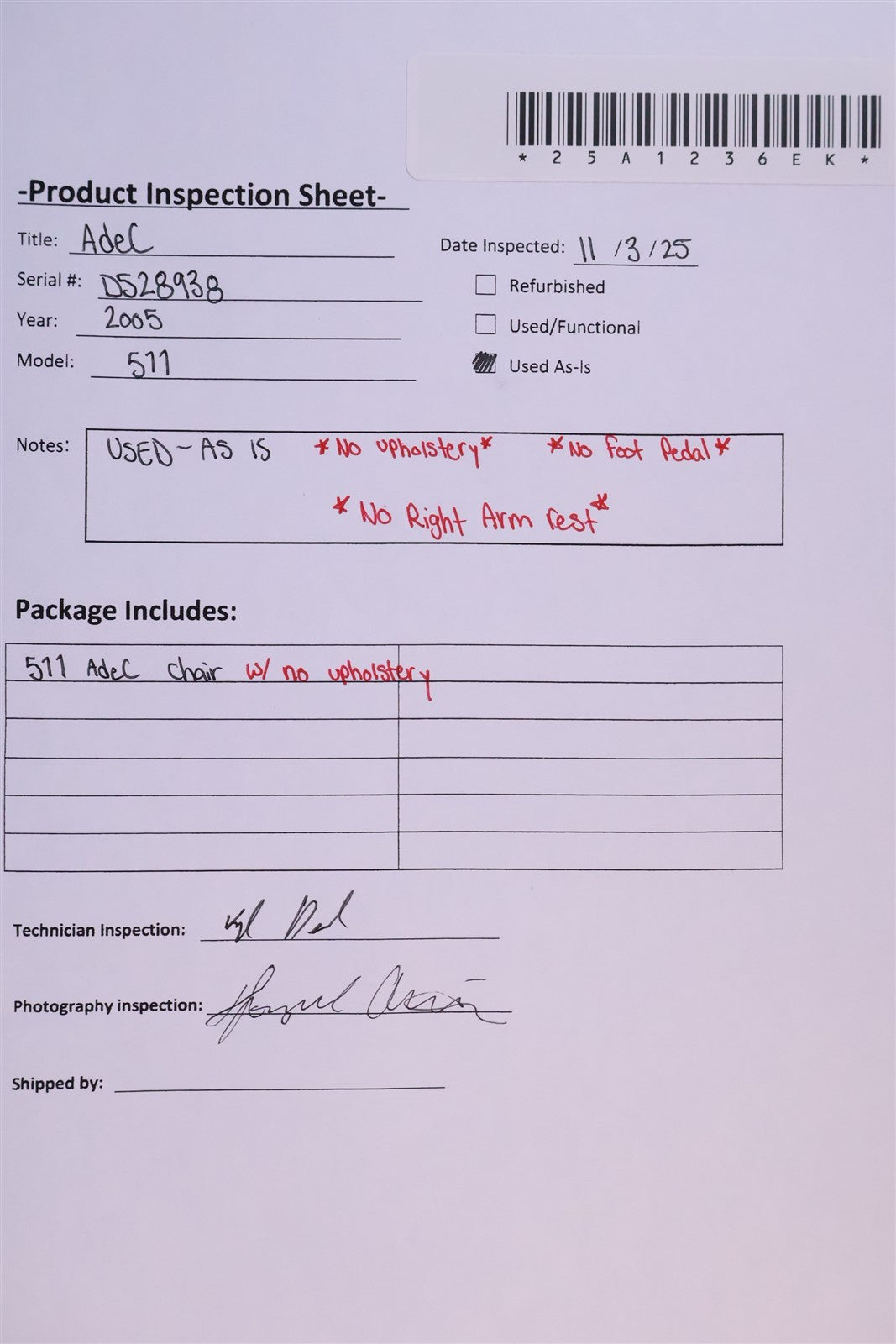 Your purchase will NOT include:RIGHT ARM REST, FOOT PEDAL, UPHOLSTERY - other accessories not shown or listed here.Prior to function testing this Adec 511 Dental exam chair, it was visually inspected for any damage. NO UPHOLSTERY. Missing right arm rest. NO junction box. NO foot pedal. USED AS-IS.