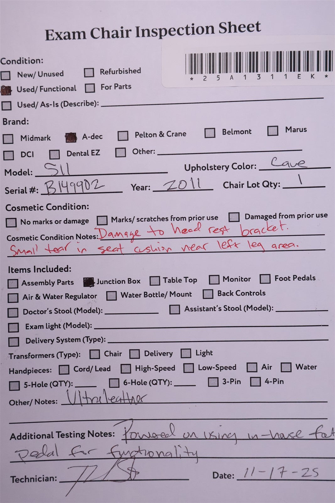 Your purchase will NOT include:This product is pre-owned and may not include the same accessories as a new, unused unit. - other accessories not shown or listed here.The exam chair has been powered on and successfully passed all functionality tests. There is a small tear in the seat cushion near the left leg area, as well as damage to the headrest bracket.
