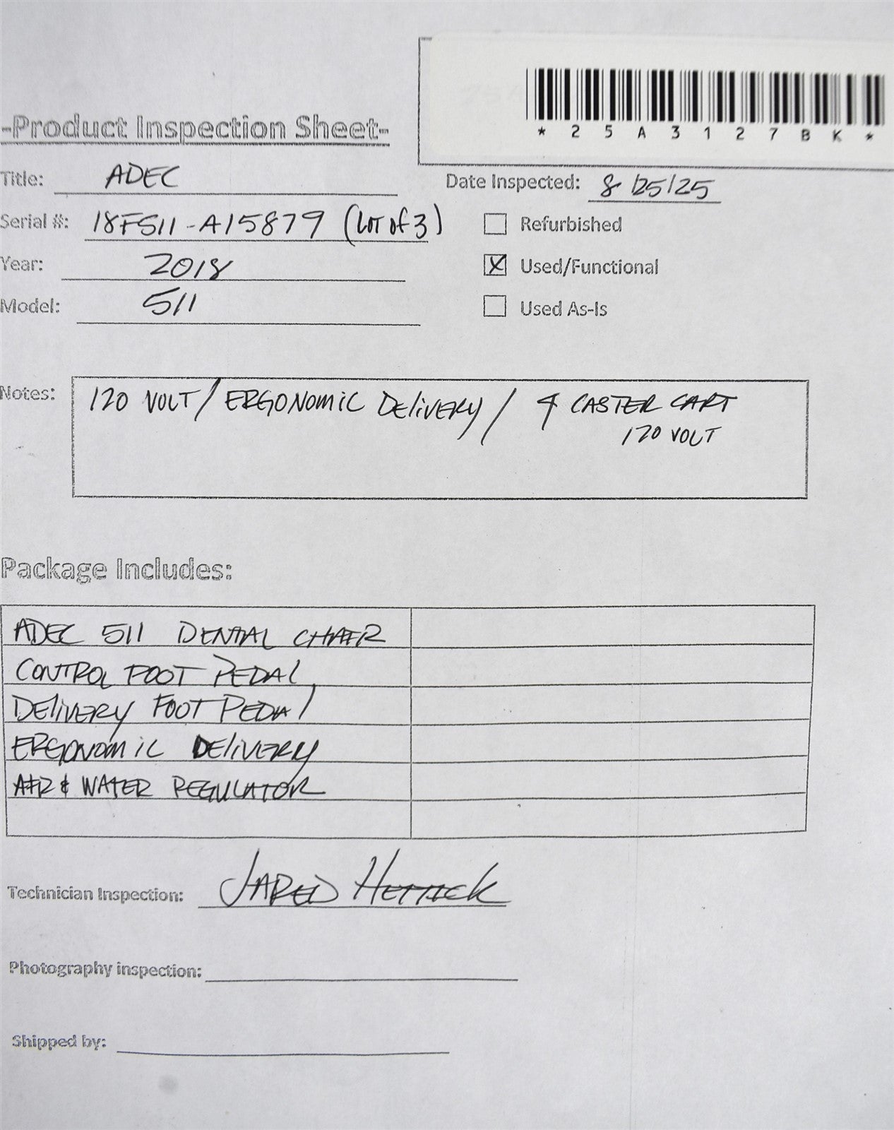 511 The A-dec 511 Dental chair was inspected for structural integrity, functionality, and upholstery condition. The frame is sturdy with no visible cracks. The chair's hydraulic system operates smoothly, adjusting positions without delays or unusual noise. Upholstery is intact. footrest, are secure and adjustable. Delivery needs technition connected. The unit has been cleaned and disinfected. Inspection Result: - Ready for Resale.