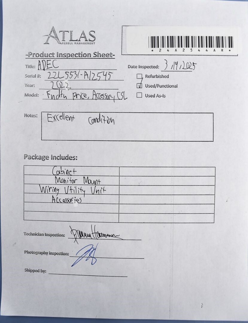 Your purchase will NOT include: N/AThis product is pre-owned and may not include the same accessories as a new, unused unit. - other accessories not shown or listed here.The ADEC Fndtn Price,Accessory CSL was visually inspected for damage or cosmetic issues. Each part is in great condition with no damage. There are some light marks on the surface of the cabinet, but no stains or scratches. Inspection Result: Passed - Ready for Resale