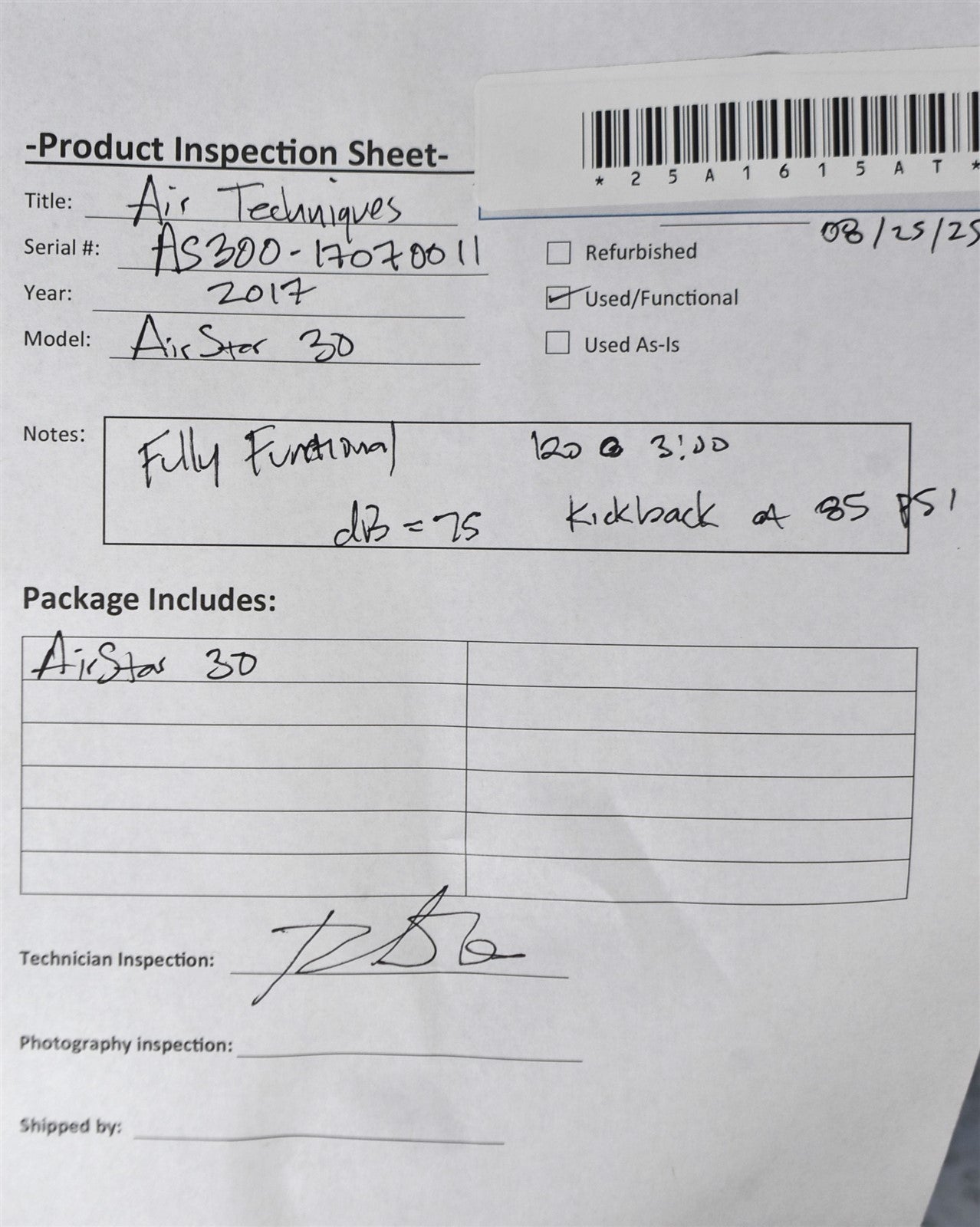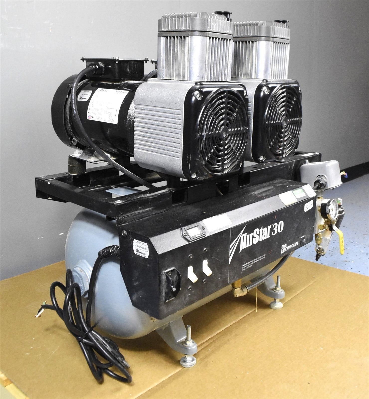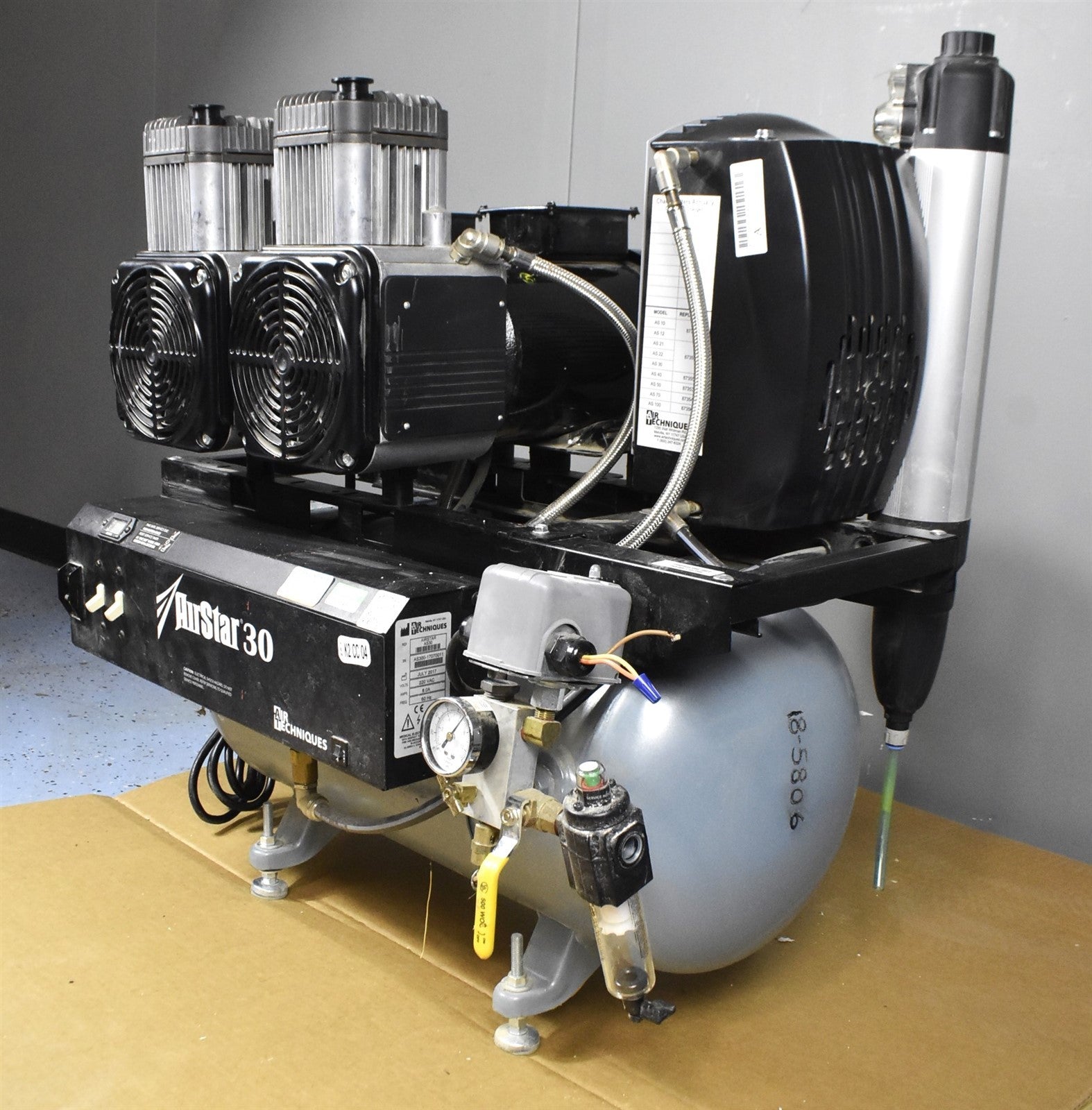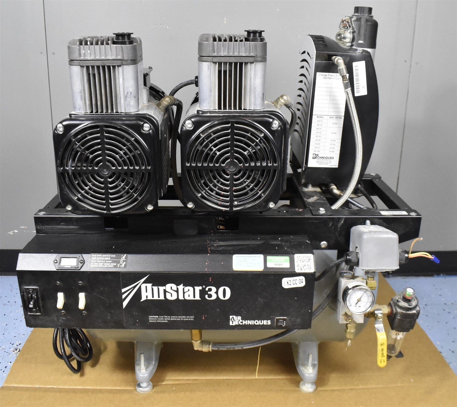 Your purchase will NOT include:This product is pre-owned and may not include the same accessories as a new, unused unit. - other accessories not shown or listed here. Air Techniques Airstar 30 Dental Air Compressor Reliable and energy-efficient air delivery for dental operatories Quiet operation suitable for clinical environments Compact design for easy placement in dental offices Oil-free, maintenance-friendly pump for long-term reliability Supports multiple operatories with consistent airflow Durable construction engineered for daily dental use Automatic pressure regulation for consistent performance Integrated safety features to protect the unit and operators Trusted Air Techniques engineering and supportThe unit has been thoroughly tested and confirmed to be in full working condition