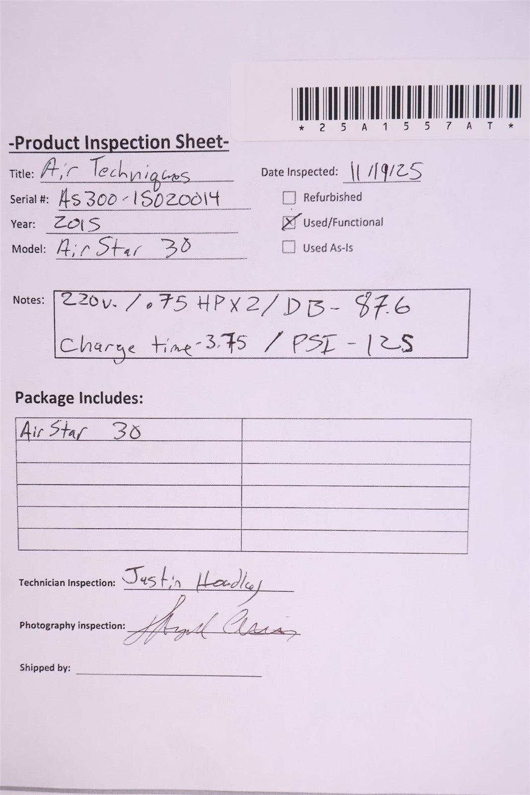 Your purchase will NOT include:This product is pre-owned and may not include the same accessories as a new, unused unit. - other accessories not shown or listed here.The unit was connected to power and operated until the storage tank reached full capacity. Each motor was individually started and shut down using the front‑panel switches to verify proper switch functionality. All systems responded as expected, and the compressor demonstrated normal operation throughout testing. Based on these results, the AirStar 30 is confirmed to be fully functional.