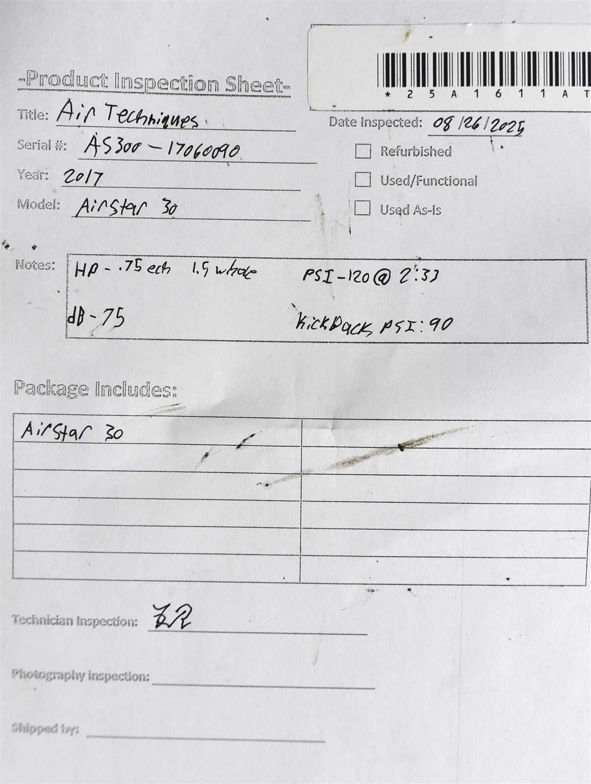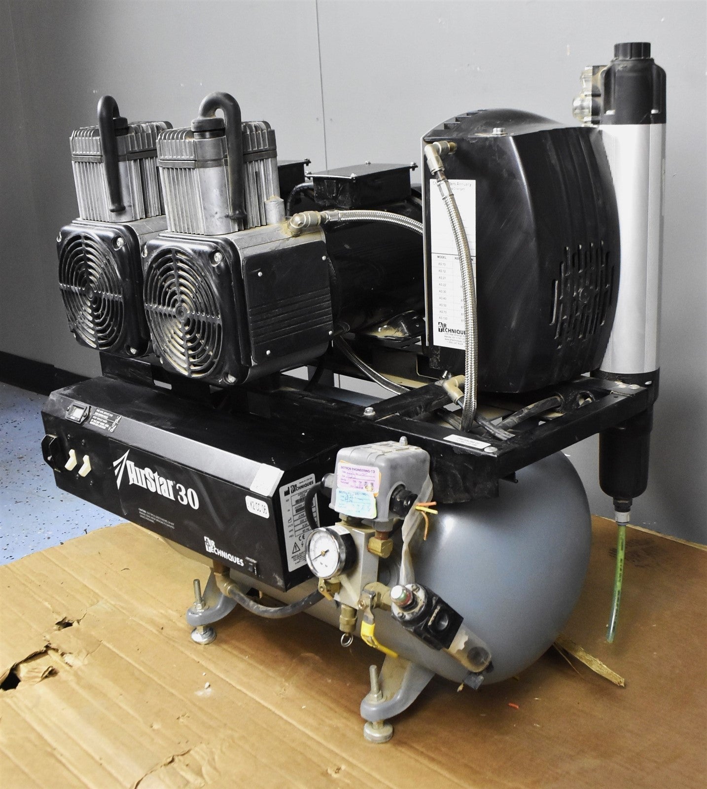 Your purchase will NOT include:This product is pre-owned and may not include the same accessories as a new, unused unit. - other accessories not shown or listed here. Air Techniques Airstar 30 Dental Air Compressor Reliable and energy-efficient air delivery for dental operatories Quiet operation suitable for clinical environments Compact design for easy placement in dental offices Oil-free, maintenance-friendly pump for long-term reliability Supports multiple operatories with consistent airflow Durable construction engineered for daily dental use Automatic pressure regulation for consistent performance Integrated safety features to protect the unit and operators Trusted Air Techniques engineering and supportThe unit was inspected and tested. During evaluation, it was determined that the switch, motor, and capacitor required replacement. These components have been replaced, and the unit is now fully operational.