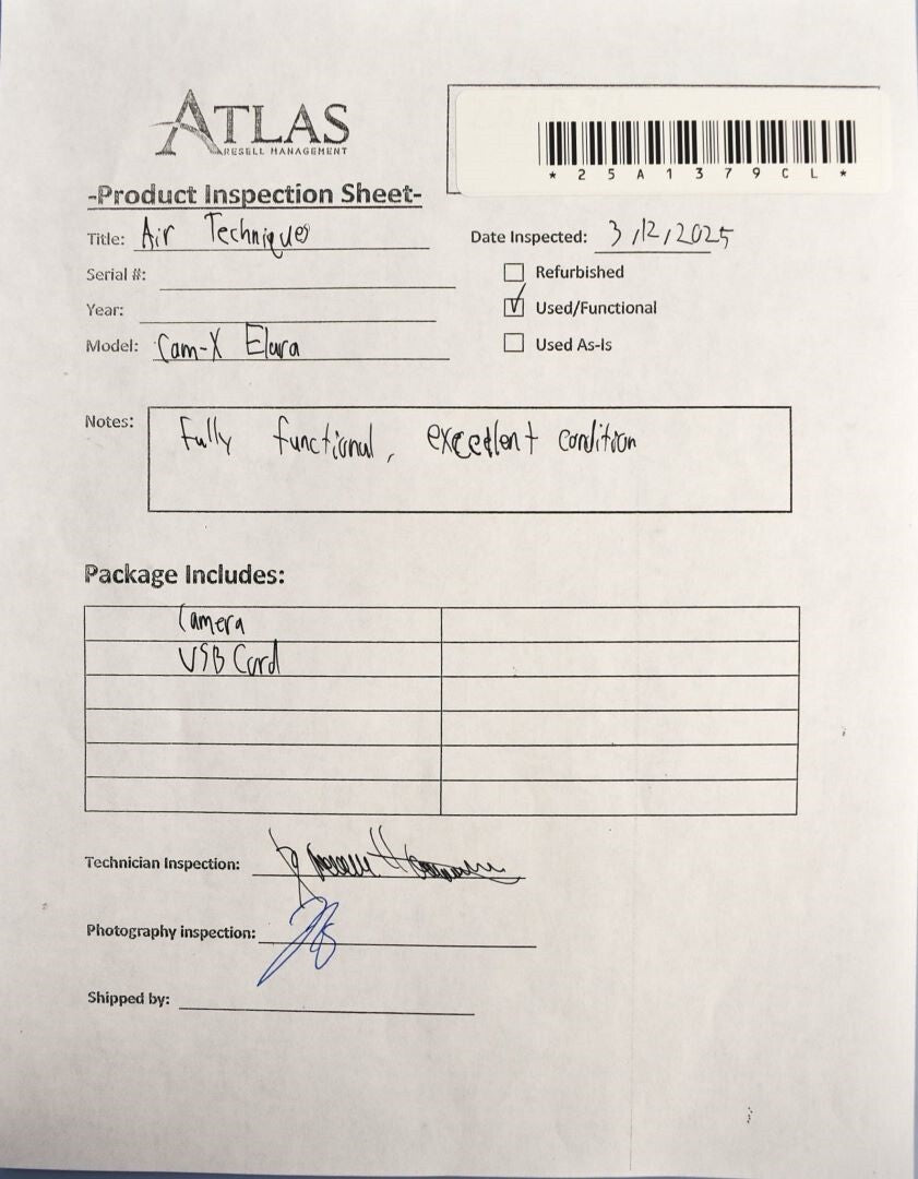 The Air Techniques Cam-X Elara was inspected for image quality and overall condition. The image is excellent without any flaws. The condition is excellent without any damage or marks. Inspection Result: Passed - Ready for Resale