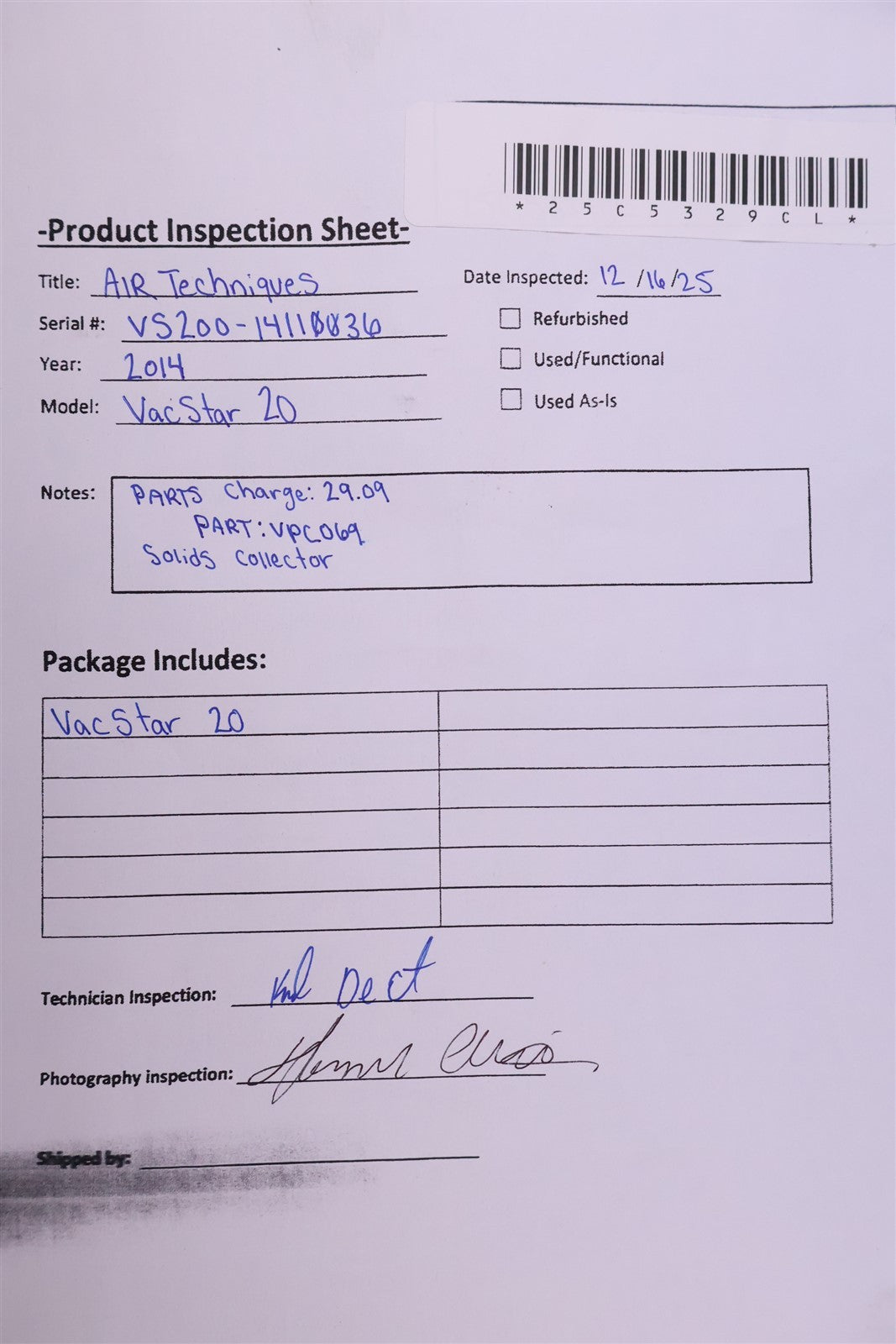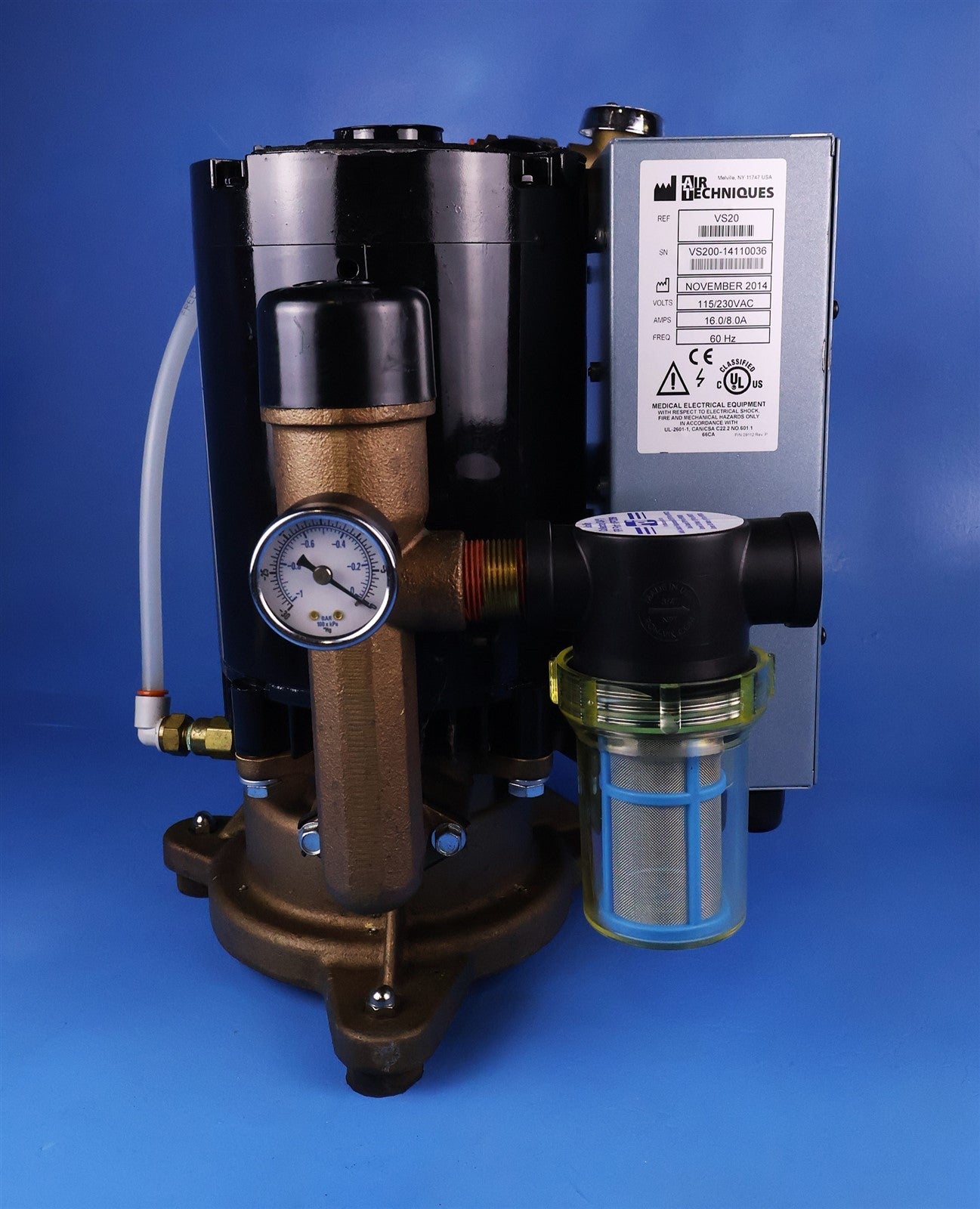 Your purchase will NOT include: This product is pre-owned and may not include the same accessories as a new, unused unit. - other accessories not shown or listed here.Prior to function testing this Air Techiques VacStar 20 Vacuum pump, it was visually inspected for any damage or missing components that would interfere with units complete desired function. Unit is complete and damage free. Proceeded to hardwire power cord to required 220V power source. I then powered vacuum pump on, which sounds smooth and free of obstruction. With a dB reading of 64-66. Connected to water and allowed unit to undergo stress test. Suction is adequate. Hg reading is 11 with water. This Air Techniques VacStar 20 Wet Vacuum Pump is FULLY FUNCTIONAL. FINAL PRODUCT INSPECTION-PASSED.