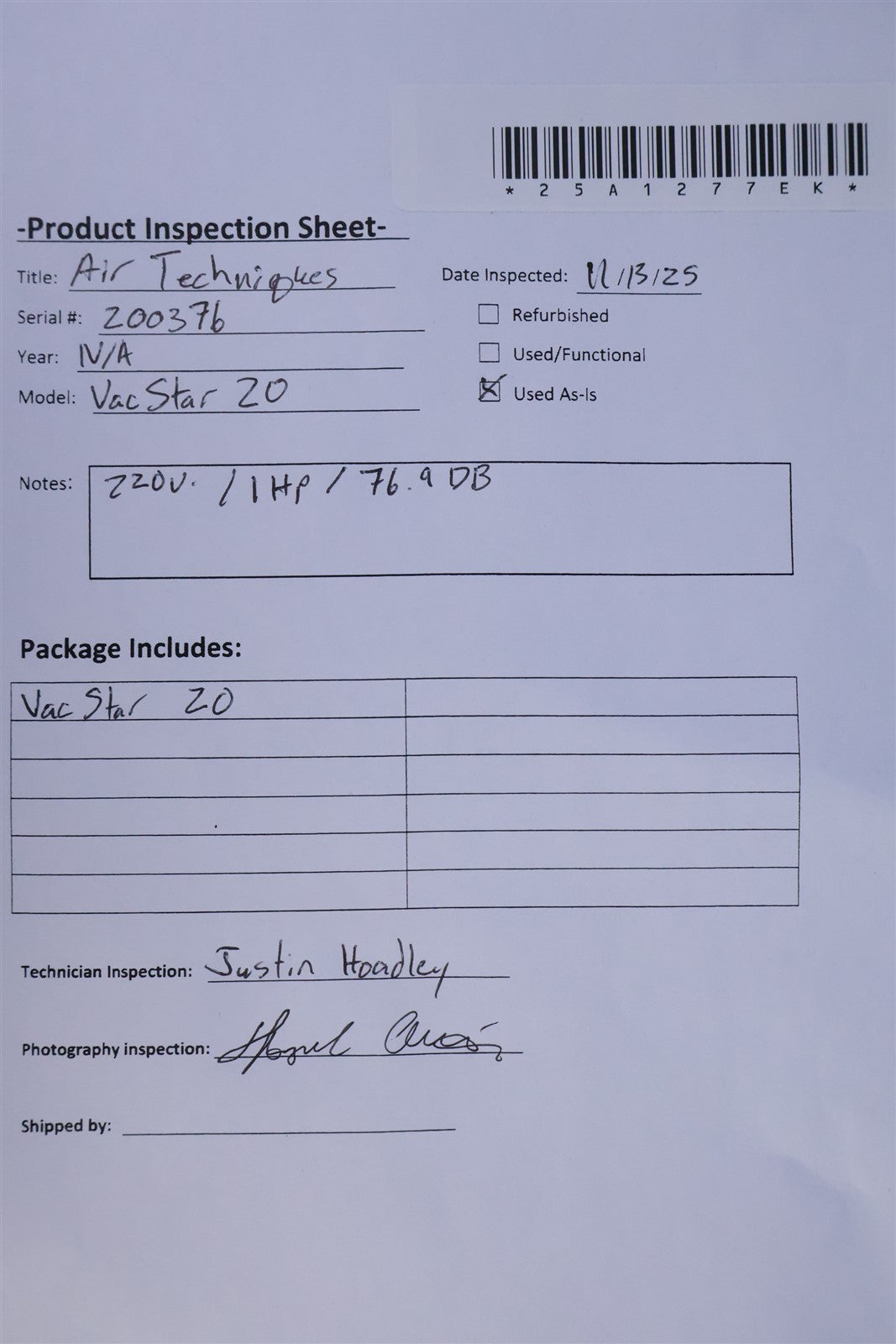 Your purchase will NOT include: - other accessories not shown or listed here.Upon powering on the VacStar 20 unit, the motor operated smoothly and generated consistent vacuum suction. Based on this performance, the system is confirmed to be fully functional and operating within expected parameters.
