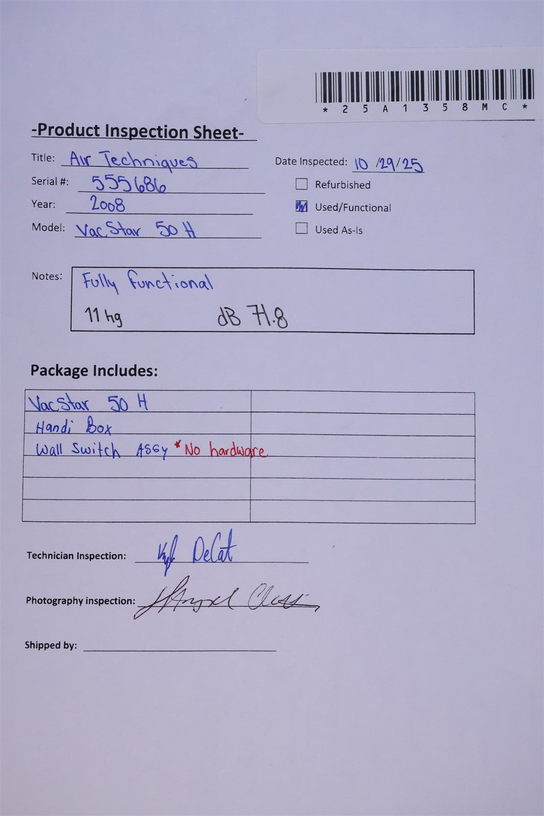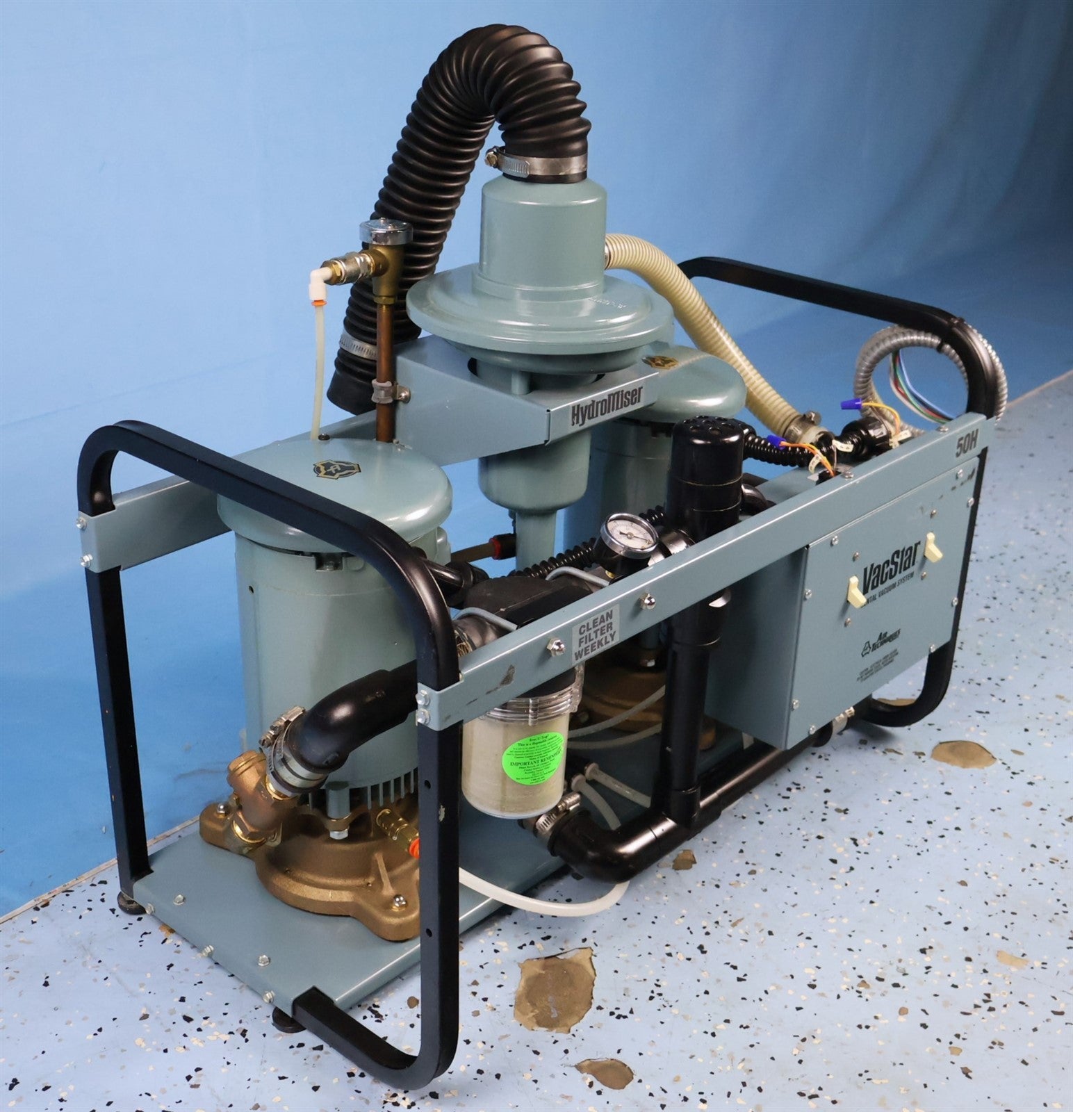 Your purchase will NOT include: hardware for wall switch assyThis product is pre-owned and may not include the same accessories as a new, unused unit. - other accessories not shown or listed here.Prior to function testing this Air Techniques VacStar 50H it was visually inspected for any damage or missing components that would impede complete functionality. Unit is compete and only damage to notate is cosmetic which is a scratch on faceplate. Proceeded to hardwire unit to required 230V power source, powering each motor on individually to ensure smooth and sound free of obstruction. Once unit was deemed functional, put unit under a stress test with water. Allowed unit to run for about 10 minutes, water flowed through the water recycler and the flow control works as well. Unit reads 71.9 dB. This unit is fully functional. FINAL INSPECTION STATUS- PASSED.