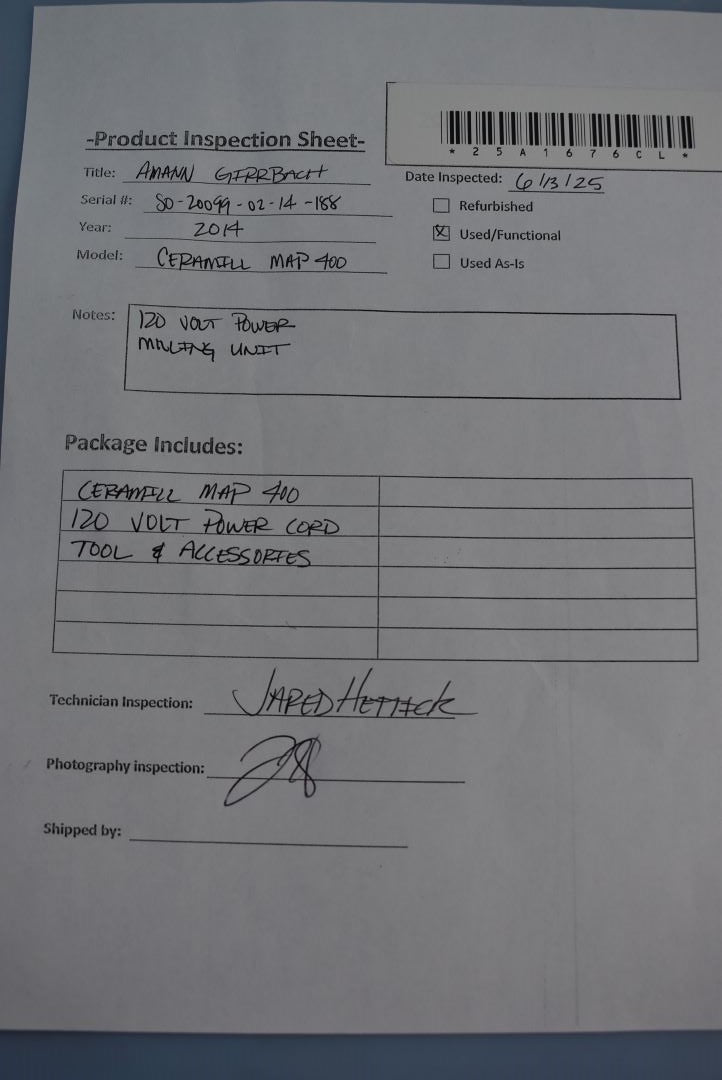 CERAMILL MAP400, was checked over for dents, scratches and defects. powered on unit. Unit self ajusted, opened door looked at camara lens. No srcatches were found. The unit has been cleaned and disinfected. Inspection Result: - Ready for Resale.