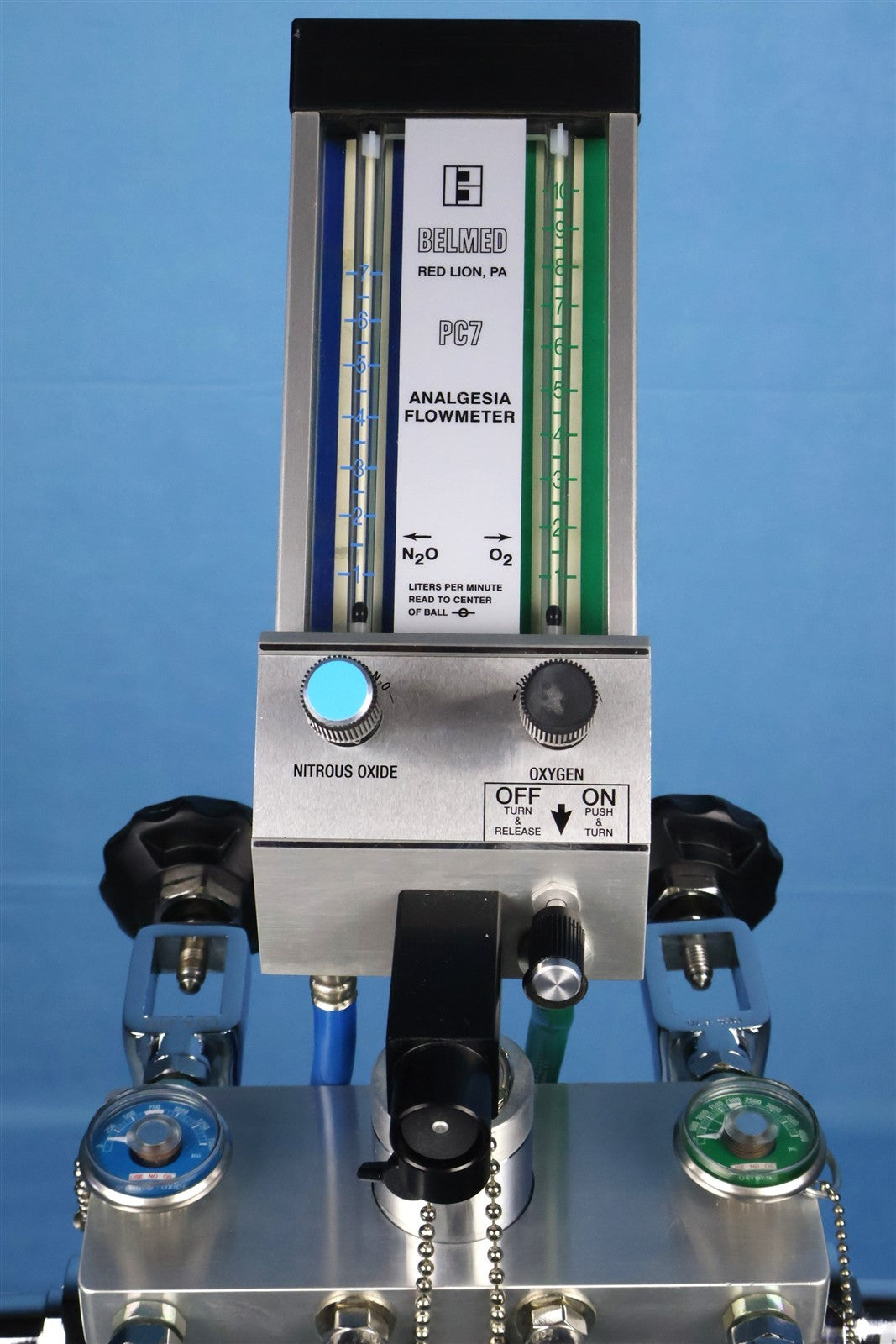 The Belmed PC7 Flowmeter was subjected to a comprehensive inspection to verify that the flowmeter float balls travel freely within the sight glass, ensuring accurate gas flow indication. New pressure regulators were installed to restore optimal performance, and the check valves were disassembled, cleaned, and reconditioned to maintain proper directional flow. Following these procedures, the unit has been fully refurbished and is confirmed to be in reliable, functional condition.