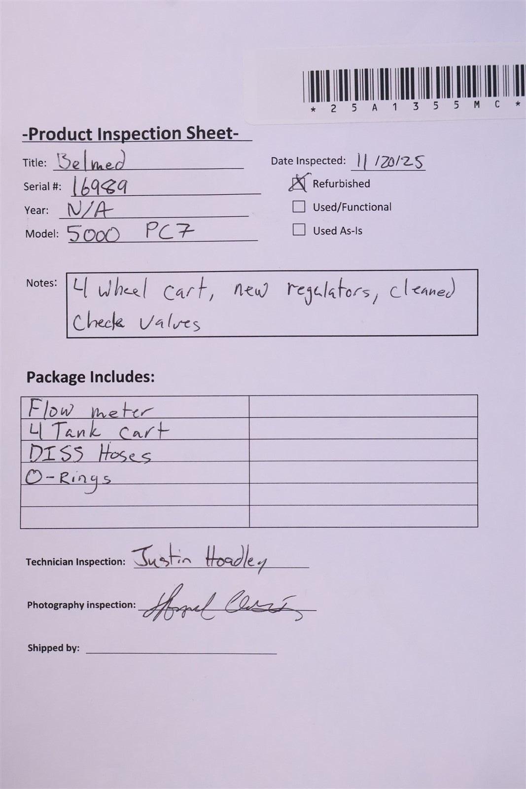 Your purchase will NOT include: - other accessories not shown or listed here.The Belmed PC7 Flowmeter was subjected to a comprehensive inspection to verify that the flowmeter float balls travel freely within the sight glass, ensuring accurate gas flow indication. New pressure regulators were installed to restore optimal performance, and the check valves were disassembled, cleaned, and reconditioned to maintain proper directional flow. Following these procedures, the unit has been fully refurbished and is confirmed to be in reliable, functional condition.