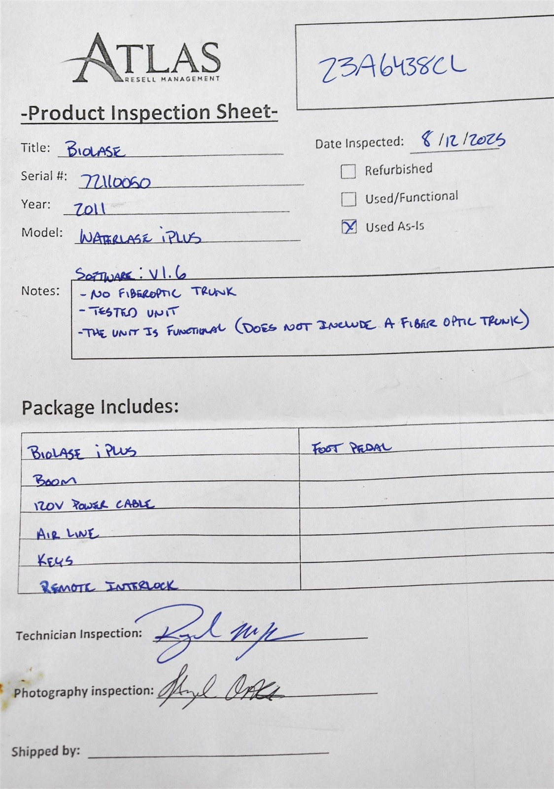 Your purchase will NOT include: Biolase Manual, Tips, Safety Glasses, fiber optic - other accessories not shown or listed here.Biolase Waterlase iPlus – Dental Laser SystemKey FeaturesAdvanced laser technology for precise soft and hard tissue procedures.Minimally invasive treatment for patient comfort and faster healing.User-friendly interface with customizable settings for various procedures.Durable design for consistent performance in busy dental practices.Biolase Waterlase iPlus – Efficient and precise laser treatment for modern dentistry.Visually inspected the unit for any damaged or missing parts and accessories. This unit does not come with a fiberoptic trunk. Borrowed a fiber trunk from another unit. Function tested the unit and found it to be functional. This unit is incomplete without the fiber trunk.
