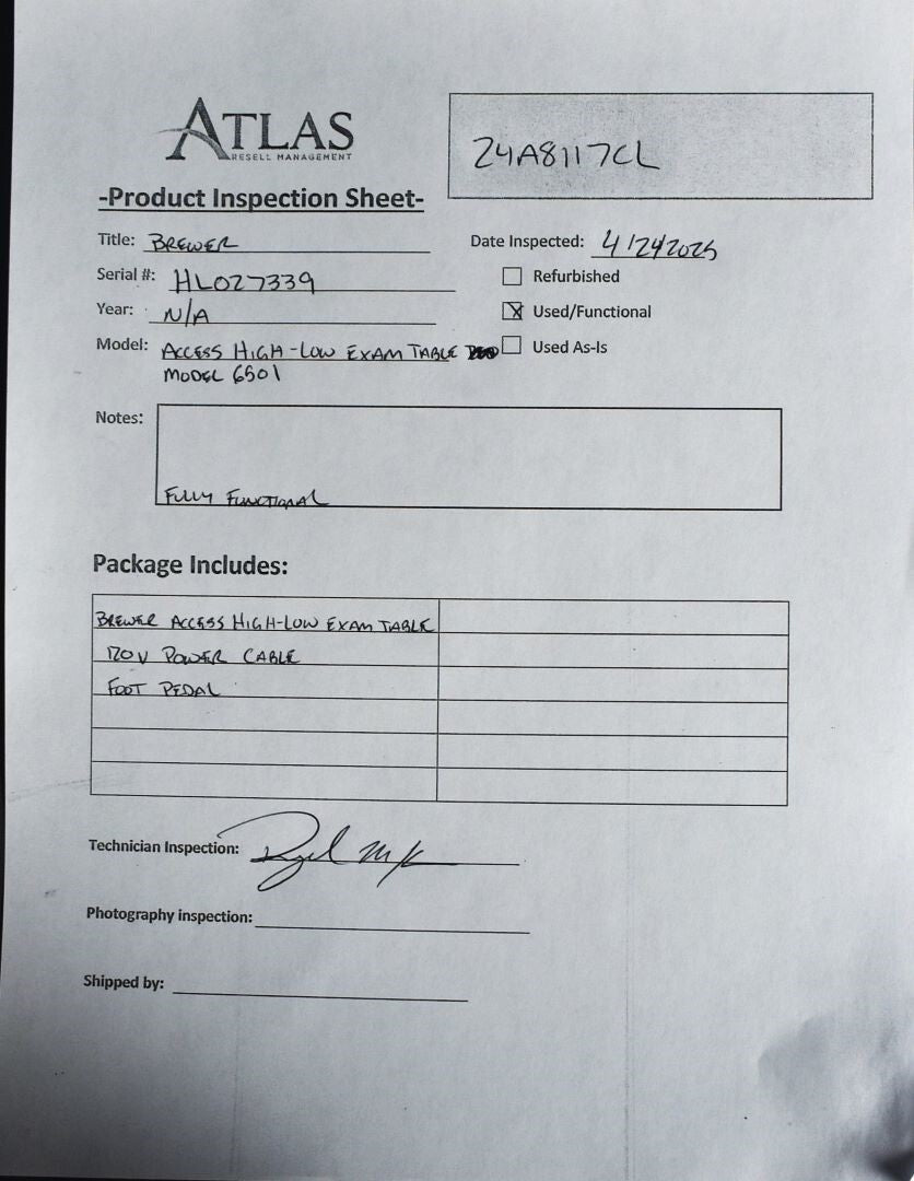 1- Brewer Access High-Low Exam Table, 1- Power Cord, 1- Foot Pedal.
