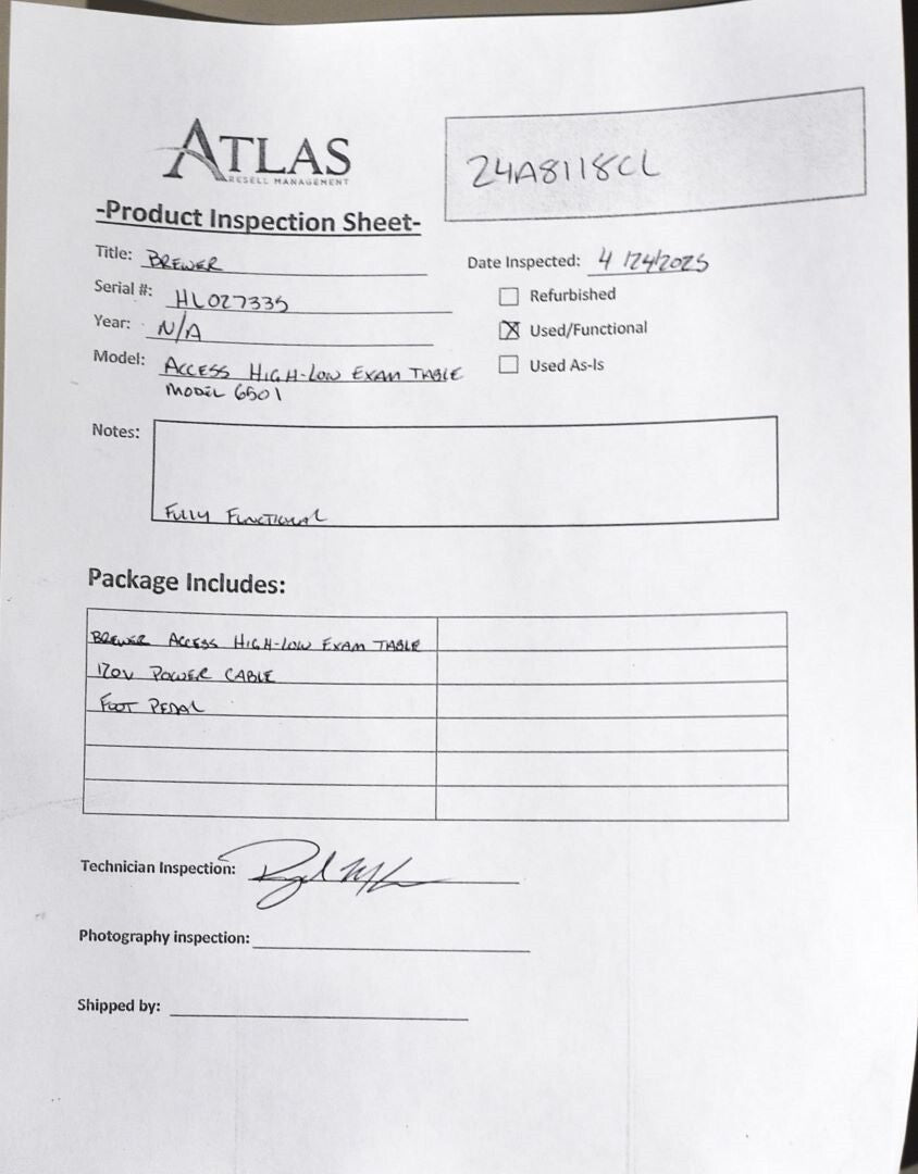 Brewer High-Low Access exam TABLE, Power Cord, Foot Pedal