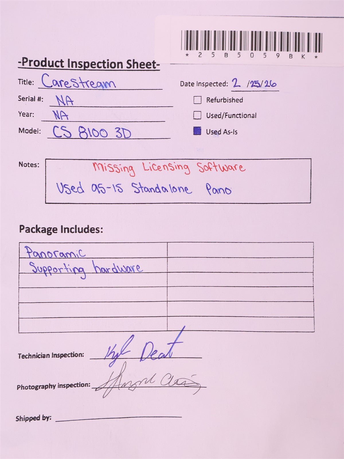 Visually inspected this CareStream CS8100 3D for any damage or missing components. NO damage. Could not locate licensing softwares or manuals in this package. NO CS 3D Imaging software (base imaging and CBCT tools), PC + monitor DOES NOT INCLUDE THESE STATED ITEMS. Item included are panoramic, supporting hardware. THIS UNIT IS USED AS-IS.