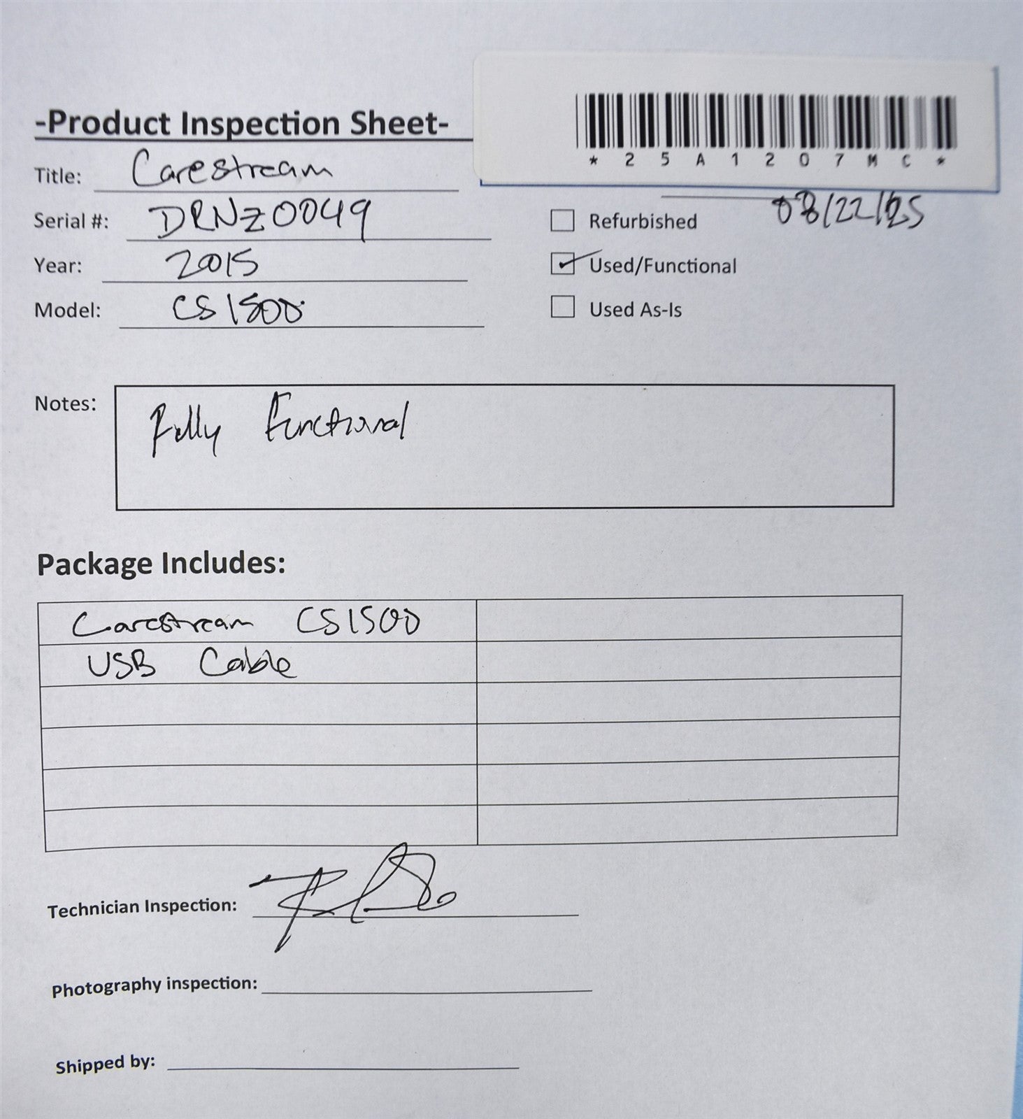 Your purchase will NOT include: This product is pre-owned and may not include the same accessories as a new, unused unit. - other accessories not shown or listed here. True Autofocus with Liquid Lens Technology: Automatically focuses like the human eye—no manual adjustments needed. Superior Image Resolution: 1024 × 768 still images, offering exceptional detail for patient education and diagnostics. Wide Focus Range: From 1 mm to infinity—captures full-arch to macro views with sharp clarity. Auto-Adjusting 8-LED Lighting: Optimizes illumination and contrast for true-to-life color in any environment. Wired or Wireless Options: Available in both configurations for flexible setup and sharing between operatories. One-Button Image Capture: Simple ergonomics—capture and save images via USB or SD card with a single button press. Lightweight & Ergonomic Design: Comfortable handpiece (around 61 g) with easy maneuverability—even in hard-to-reach areas. TWAIN Compliant: Seamlessly integrates with Carestream software and third-party dental imaging systems.Visually inspected the unit for any damages or missing parts and accessories.