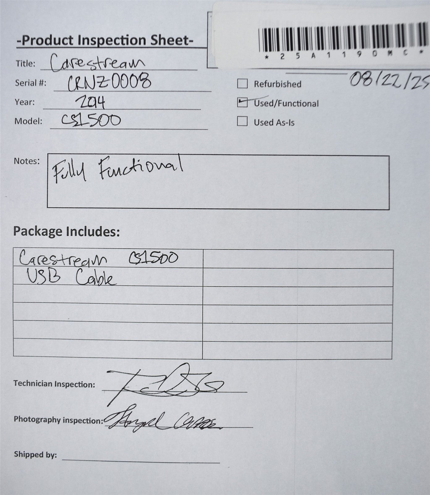 Your purchase will NOT include: This product is pre-owned and may not include the same accessories as a new, unused unit. - other accessories not shown or listed here. True Autofocus with Liquid Lens Technology: Automatically focuses like the human eye—no manual adjustments needed. Superior Image Resolution: 1024 × 768 still images, offering exceptional detail for patient education and diagnostics. Wide Focus Range: From 1 mm to infinity—captures full-arch to macro views with sharp clarity. Auto-Adjusting 8-LED Lighting: Optimizes illumination and contrast for true-to-life color in any environment. Wired or Wireless Options: Available in both configurations for flexible setup and sharing between operatories. One-Button Image Capture: Simple ergonomics—capture and save images via USB or SD card with a single button press. Lightweight & Ergonomic Design: Comfortable handpiece (around 61 g) with easy maneuverability—even in hard-to-reach areas. TWAIN Compliant: Seamlessly integrates with Carestream software and third-party dental imaging systems.