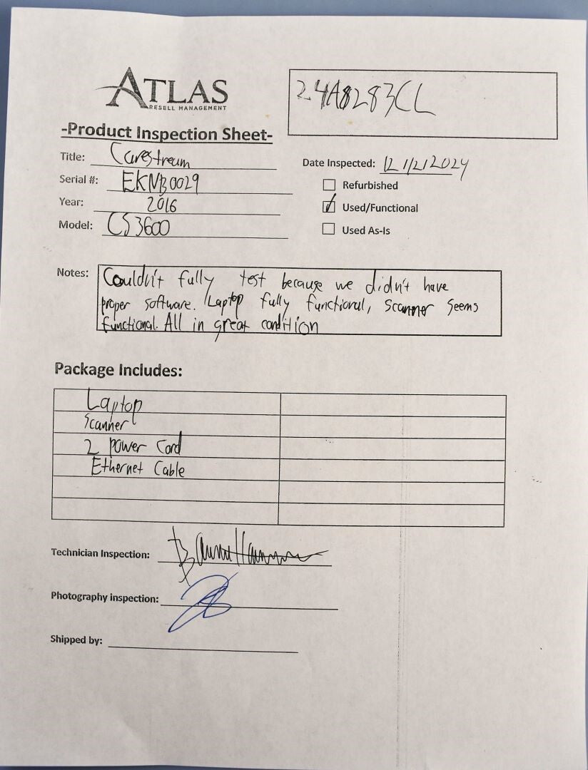 The laptop is fully functional and the scanner turns on and is recognized when connected. I couldn't test the scanner fully because the software doesn't work. It couldn't run unless it was connected to the server of the seller we got it from, and it can only be reenabled if the software is downloaded again. This means that a copy of the Carestream Software will need to be installed for this to be used. Since the software that's on it has no use, I reset the laptop and removed all files from it. -BH