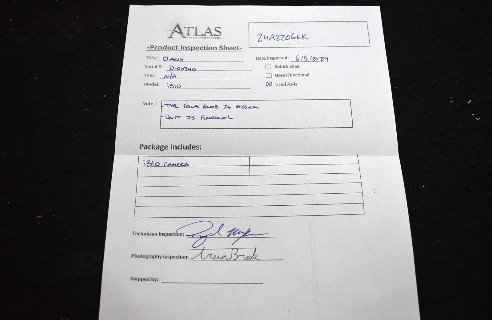 Your purchase will NOT include: manufacturer warranty, or any other accessories not shown or listed here.Visually inspected the unit for any damaged or missing parts and accessories. The camera is missing the focus knob. Function tested the unit and found that the unit is functional. Included a photo taken by this unit. Used/as-is.