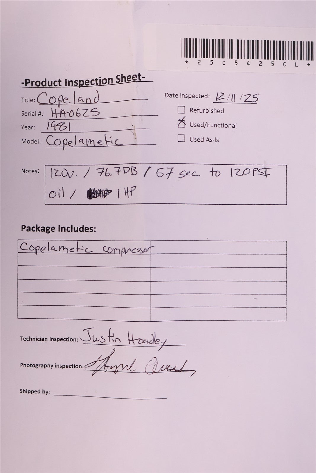 Your purchase will NOT include:This product is pre-owned and may not include the same accessories as a new, unused unit. - other accessories not shown or listed here.The Copeland Copematic compressor was energized and brought to operating condition for evaluation. A full visual and operational inspection was performed, including checks for external air leaks, oil seepage, and abnormal vibration or noise. The compressor was then run through a pressure‑build test; the unit reached 120 PSI in 57 seconds, which is within acceptable performance parameters for a system of this age and configuration. Based on all functional tests, the compressor is operating properly and is considered a fully functional unit.
