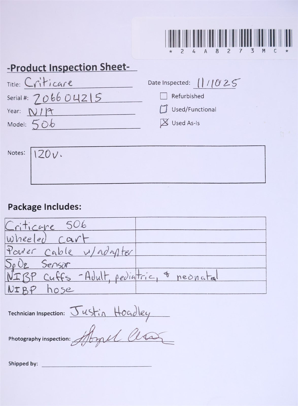 Criticare 506, Wheeled Cart, Power Cable with Adapter, SpO2 Sensor, NIBP Hose, NIBP Cuffs - Adult, Pedeatric, and Neonatal