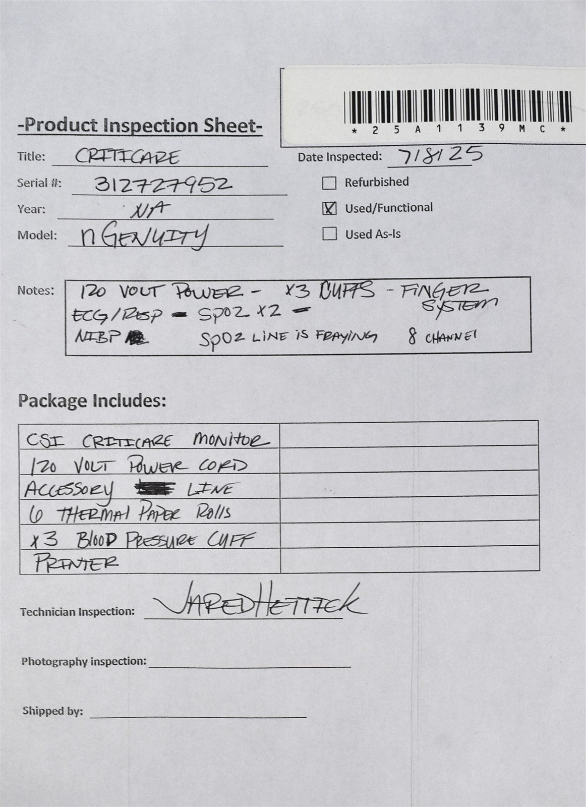 Your purchase will NOT include: This product is pre-owned and may not include the same accessories as a new, unused unit. - other accessories not shown or listed here.Criticare, Was inspected for damage. Unit is 120 volt power cord suppled. Monitor was connected to power outlet and turned on. Connected some accessories and tested myself, tested printer fully functional. The unit has been cleaned and disinfected. Inspection Result: - Ready for Resale.