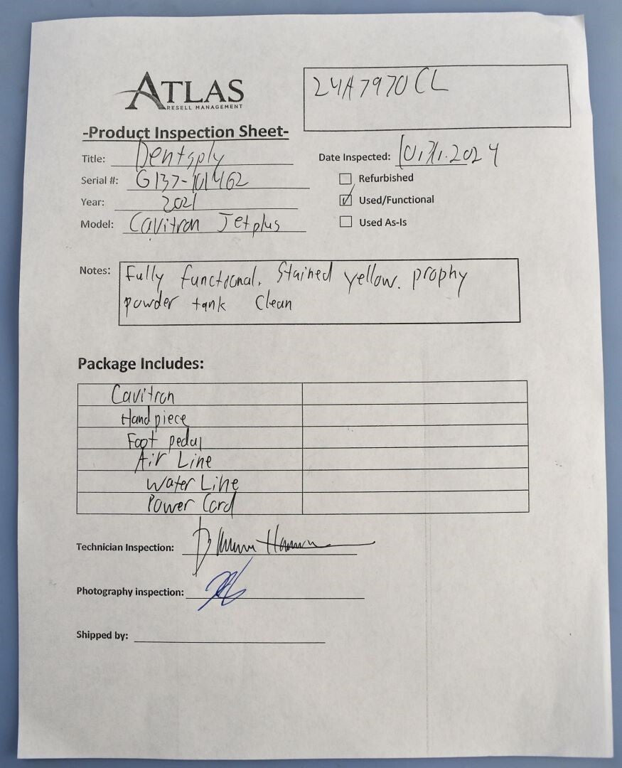 I tested the scaling, then ran water through the unit. It was fully functional. Its cosmetic condition was good, with the surface stained yellow, but the prophy powder tank being completely spotless, as if it had never been used. -BH