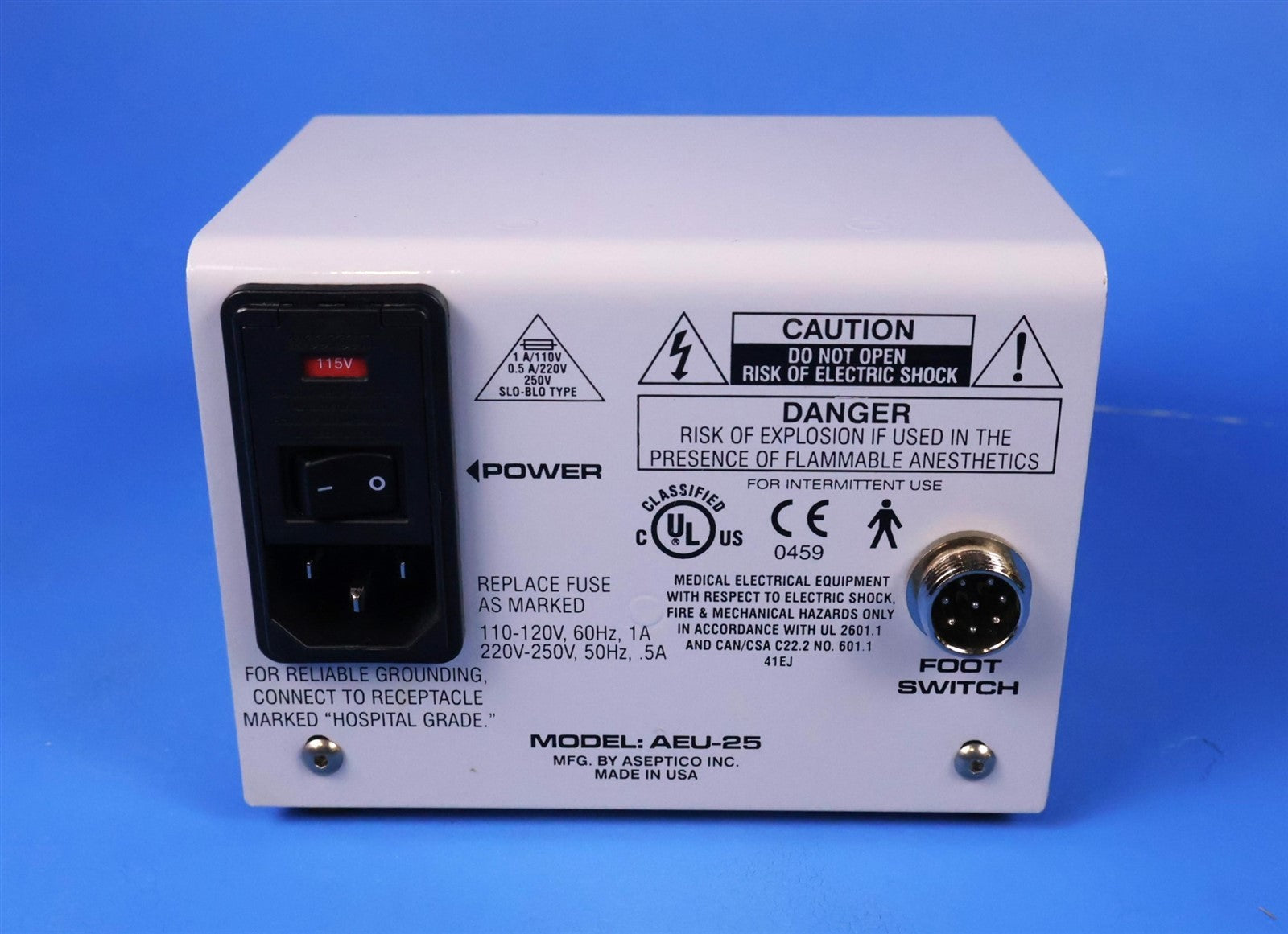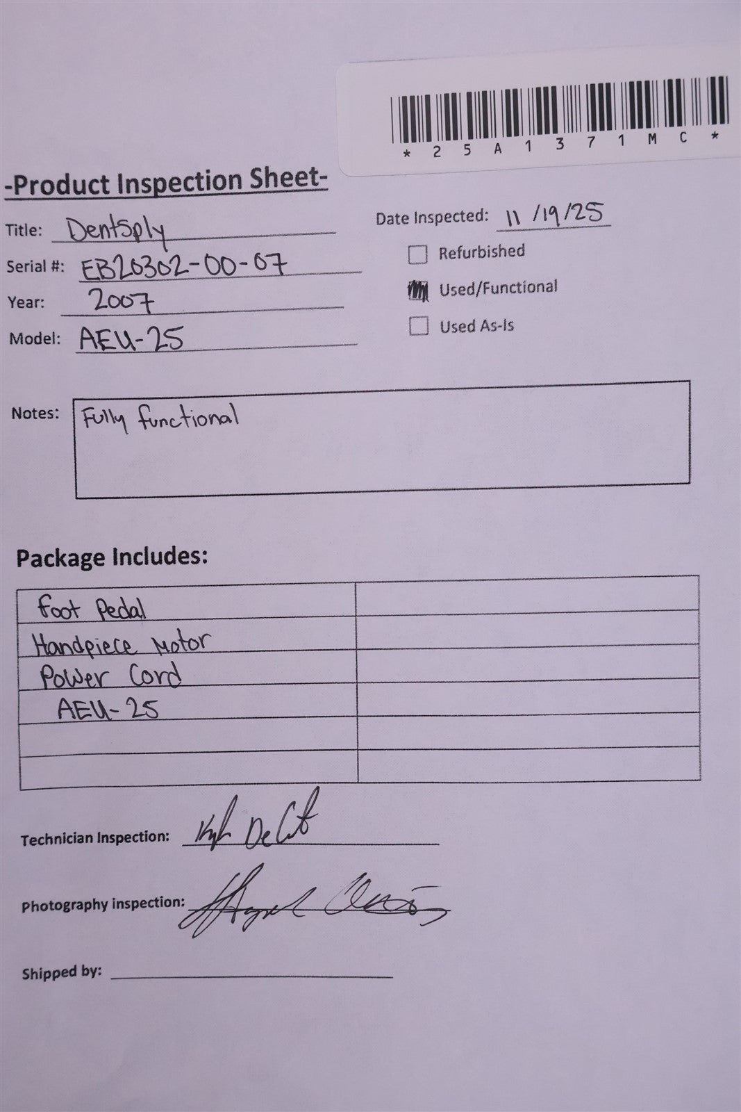Prior to function testing this Dentsply AEU-25 handpiece motor system, it was visually inspected for any damage or missing components that would interfere with units complete functionality. Unit includes required foot pedal, power cord, Asiptico handpiece motor, AEU-25. Proceeded to set unit up properly, and powering unit on. Units digital display presents a clear interface. Kepad controls all respond when interacted with. Engaged foot pedal, triggering handpiece motor. Motor sounds smooth. FINAL INSPECTION STATUS= PASSED/ FULLY FUNCTIONAL