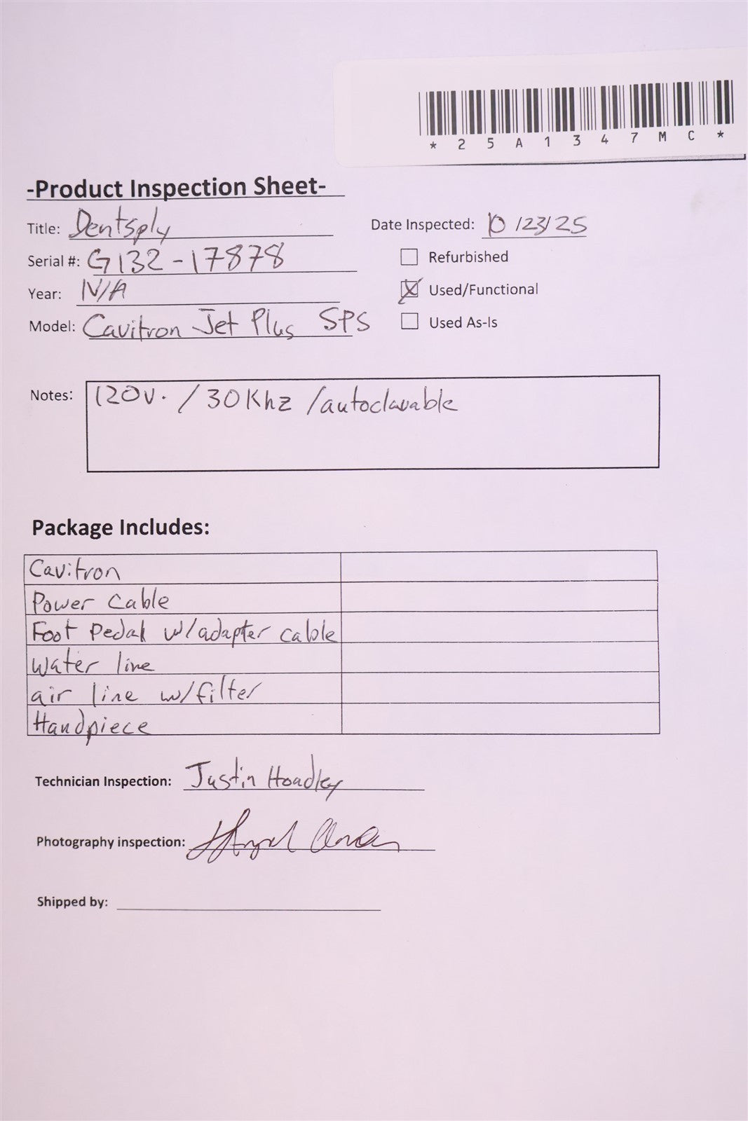 Your purchase will NOT include: This product is pre-owned and may not include the same accessories as a new, unused unit. - other accessories not shown or listed here.The unit was successfully powered on and all control interfaces, including buttons and dial, were tested to confirm operational integrity. It was connected to both water and air supplies, and the foot pedal and handpiece were evaluated under working conditions. All components performed as expected, verifying full functionality of the system.