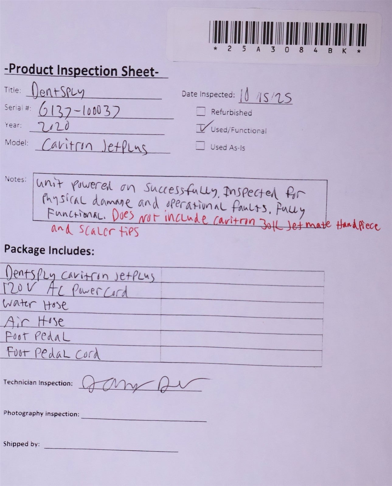 Your purchase will NOT include: Cavitron 30k Jet Mate Handpiece And Scaler Tips. This product is pre-owned and may not include the same accessories as a new, unused unit. - other accessories not shown or listed here.Unit powered on successfully; inspected for physical damage and operational faults—confirmed fully functional.