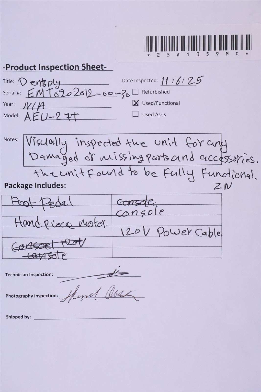 Visually inspected the unit for any damaged or missing parts and accessories. the unit found to be fully functional, with good cosmetic condition. ZN