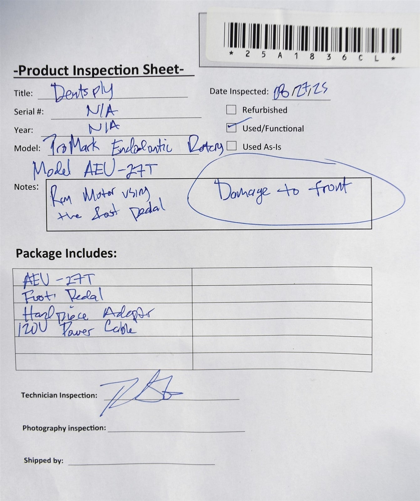 Your purchase will NOT include: This product is pre-owned and may not include the same accessories as a new, unused unit. - other accessories not shown or listed here. Advanced endodontic motor designed for rotary and reciprocating files Multiple programmable settings for customized treatment workflows Lightweight, ergonomic handpiece for comfort and precision Large, easy-to-read display for monitoring speed and torque Auto-stop and auto-reverse functions for added safety Compatible with a wide range of rotary endodontic file systems Compact design suitable for any dental operatory Reliable performance trusted by endodontists and general practitionersThe unit has been thoroughly tested and confirmed to be in full working condition as the foot pedal was used to rotate t he handpiece successfully. Unit has damage to front of machine.