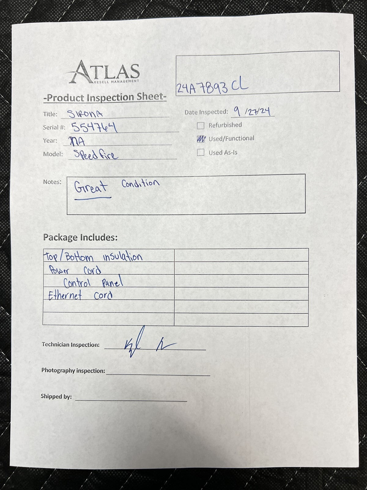 Prior to function testing unit, visually inspected for any damage and missing parts. Unit is free of damage and includes all required parts for function. Attached to 120V power source, as well as connecting digital touch screen control panel. Once Speedfire powered up, proceeded to settings where i then raised and lowered door. Door raises and lowers with no issues/complications. Started heater test to ensure unit raises in temp and maintains designated temp. Great cosmetic condition, with NO significant cosmetic condition. Digital control display is fully functional and damage free