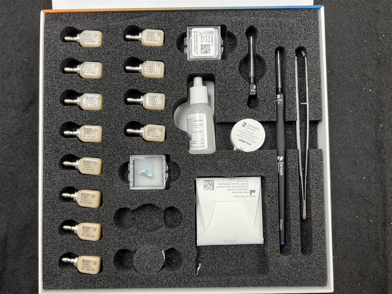 12 milling blocks 1 firing pin 1 Honeycomb 1 set of moldable silicone 1 liquid glaze 1 paste glaze 1 diamond coated tweezers 1 application brush 1 application brush extra tip