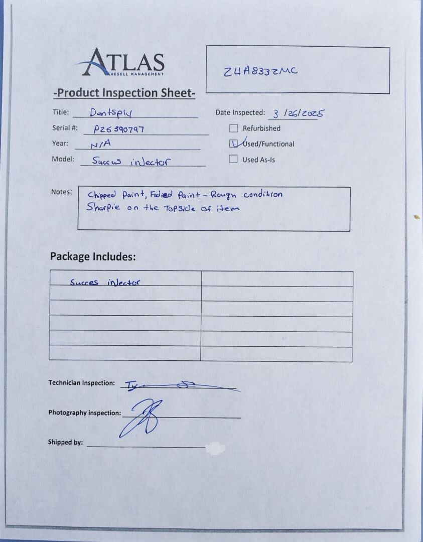 This item has no accessories included. Just the unit itself. This injector was hooked up to 75 PSI compressor and I made sure the piston does its job. This unit is fully functional. Item was tested with atlas provided hoses and adapters, as this item has no accessories included. Unit is in fair cosmetic condition because it has chipped paint, fading and dirt in hard to clean spots. Item also has sharpie on the top panel that reads "8mm wrench" Test results: Passed