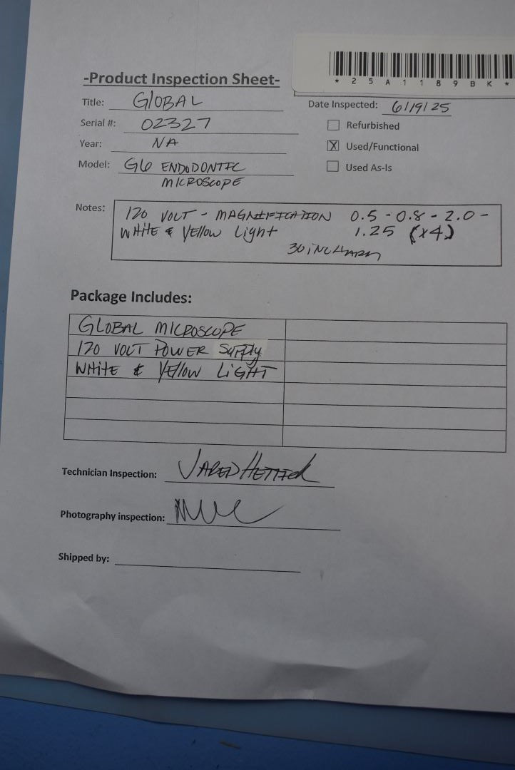 The Global was inspected for structural integrity, functionality, and condition. The frame is sturdy with no visible cracks or damage. All eletronic controls, including the preset positions and safety switches, function properly. Checked lenses for scratches and magnification. All Knobs functional, with no scratching or noise. The unit has been cleaned and disinfected. Inspection Result: - Ready for Resale.